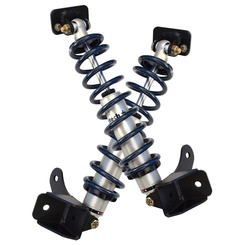 Rear HQ Coil-Overs for 1978-1988 GM G-Body. For use with stock 10/12 bolt housing. Includes a pair of rebound adjustable shocks, springs, spring mounts, brackets and delrin spring washers.