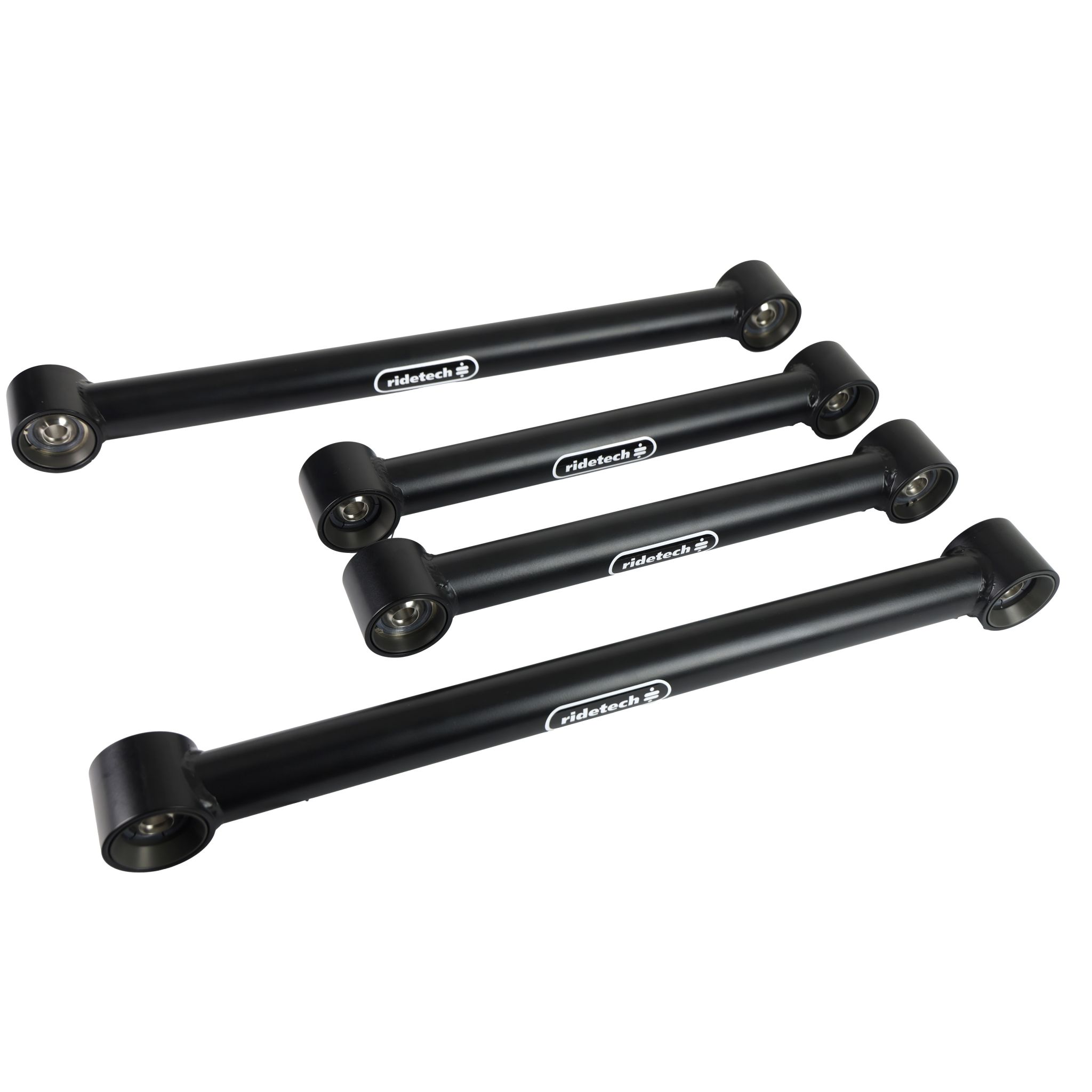 Eliminate wheel hop on 2009-2025 Ram 1500 with Ridetech rear StrongArms with R-Joint rod ends. The factory rear control arms use a large rubber bushing that allows deflection which can lead to wheel hop in higher horsepower trucks. They are constructed with 1.75” x .125” wall dom tubing and are powder coated satin black. They are a direct replacement for the factory trailing arms and will fit stock height, lowered or mild lift trucks. The patented R-Joint rod ends combine the best qualities of low friction movement, lateral stability, full range articulation, and quiet operation into one special bearing that is as home on the street as it is on the racetrack! Made in the USA!