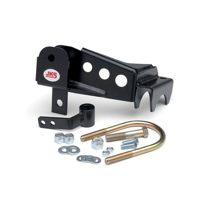 Correct Jeep Wrangler JK rear suspension geometry with a JKS Rear Track Bar Relocation Bracket. The design compensates for improper track bar alignment / orientation after adjusting rotation of the axle housing. Requires 2.0 to 6.0 in. suspension lift. The heavy duty steel bracket attaches directly to factory track bar mount on your Jeep's axle housing. It relocates the mounting point 4.0 in. higher to reduce track bar operating angle and improve handling at speed. Eliminates binding and premature bushing wear. Minimizes risk of track bar failure. Protective powder coat finish resists corrosion.