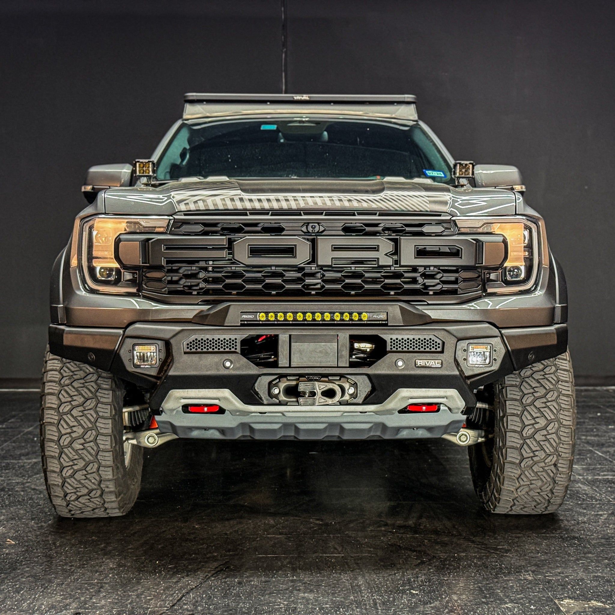 RIVAL Aluminum Bumpers are crash tested to ensure all factory safety systems work properly. Built from 1/4-in thick aluminum alloy, contains 3/16-in thick steel winch mount. The RIVAL Aluminum Bumper for 2024-2025 Ford Ranger Raptor requires no extensive modifications to your vehicle. While the bumper itself is easy to install, we recommend having someone knowledgeable in dealing with proximity and radar sensors perform the installation. These are safety items that, when installed properly, will function just as they did with the factory bumper of your Ford Ranger Raptor. INCLUDED: Winch Mount for winches up to 12,000 lbs. Rated Recovery Points (11,000 lb each) Stamped Aluminum Bash Plate. Lightbar Housing Radar. Bracket Parking Sensors Bezels. License Plate Mount. NOT INCLUDED: Lights. This bumper accepts most 3 Inch auxiliary fog/driving lights including but not limited to, RIVAL Lights which are plug-and-play with the factory fog light harness. If you want to utilize the DRL and blinkers, which are also functions of our lights, additional wiring would be required. Lightbar. The lightbar housing accepts most 20 Inch bars including but not limited to, RIGID Radiance SR-Series. The housing can be set aside if lightbar is not needed. Winch. Verified winch options include, but are not limited to, these WARN Winches.