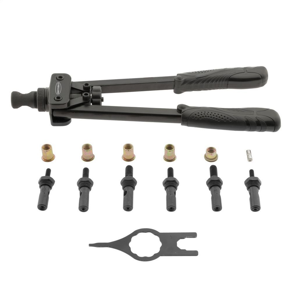 The Smittybilt Nutsert Tool Kit makes installing nutserts quick and easy with its innovative quick-change head design. This heavy-duty kit includes 3 SAE and 3 metric mandrels, along with a mandrel lock pin and quick-change tool, all stored in a durable hard case. The unique spring-loaded mandrel ensures fast, secure changes, making it the fastest on the market for efficient installation.