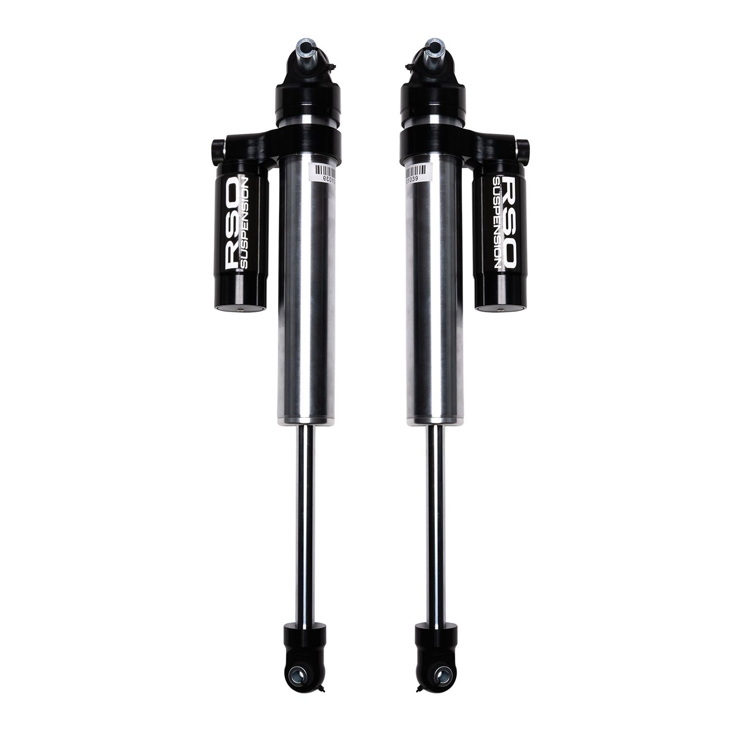 RSO Suspension Adjustable Shocks with Piggyback Reservoir provide improved suspension damping while increasing on and offroad driving comfort. They feature hand adjustable compression levels to dial in and fine tune suspension feel. These 2.5in smooth bore machined alloy bodies give maximum corrosion resistance. The 3/4in steel shafts and heat-treated steel spherical bearings offer strength and dependability. Its external reservoir allows for increased oil and nitrogen capacity giving greater heat dissipation, increasing performance, and eliminating shock fade. The piggyback design keeps the reservoir tight to the shock body away from any moving suspension components with no need for cutting or drilling. Experience for yourself the incredible performance and precise control that RSO Suspension’s new adjustable piggyback shocks deliver.