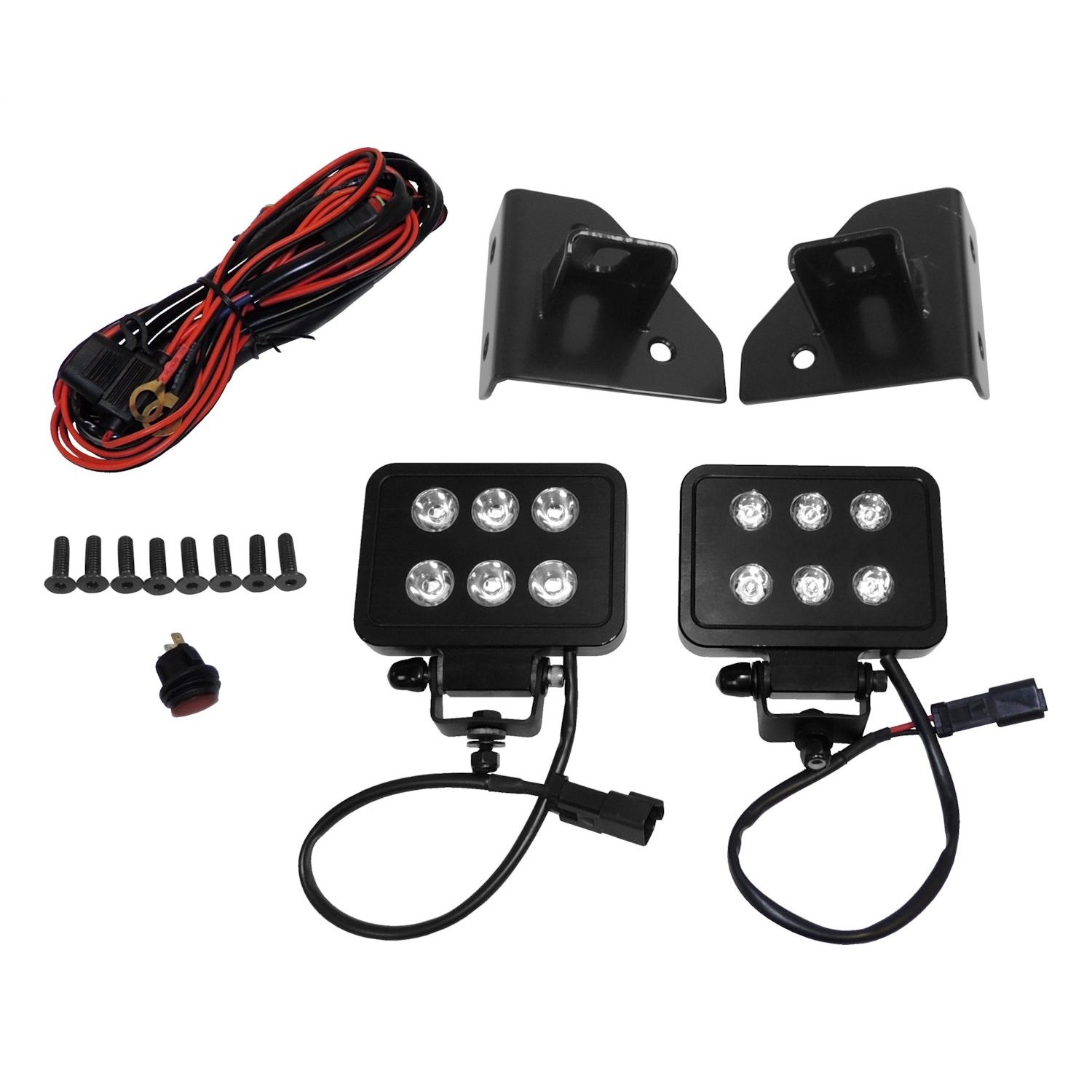 Equip your vehicle with low-profile LED Block Lamps by RT Off-Road. Each lamp is constructed of an aluminum body. The 6 Nichia LED's in each lamp produce 2400 Lumens at only 18 watts, resulting in an impressive amount of light without the need to upgrade the charging system of the vehicle. Matte black anodization, an IP86 rating, and a 50,000 hour LED bulb life means that these lamps are designed to last, even in the harshest conditions. Every aspect of product design, manufacturing, and assembling takes place in the USA. Included is a pair of block lamps measuring 3.5" x 4.5" x .75", a pair of mounting brackets with hardware, windshield light mount brackets with hardware, a wiring harness for a pair of lamps, and a switch.