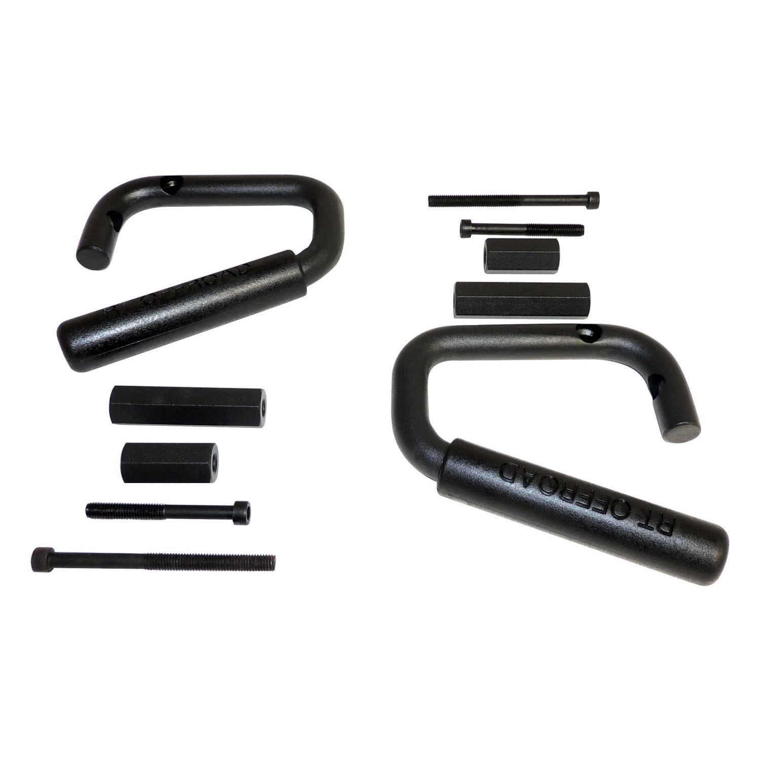 resulting in a more predictable and reliable handle. The handles are constructed of high strength steel and finished in a durable textured black powder coat with rubberized plastic grips. They mount to the top of the windshield frame using the included spacers and bolts.