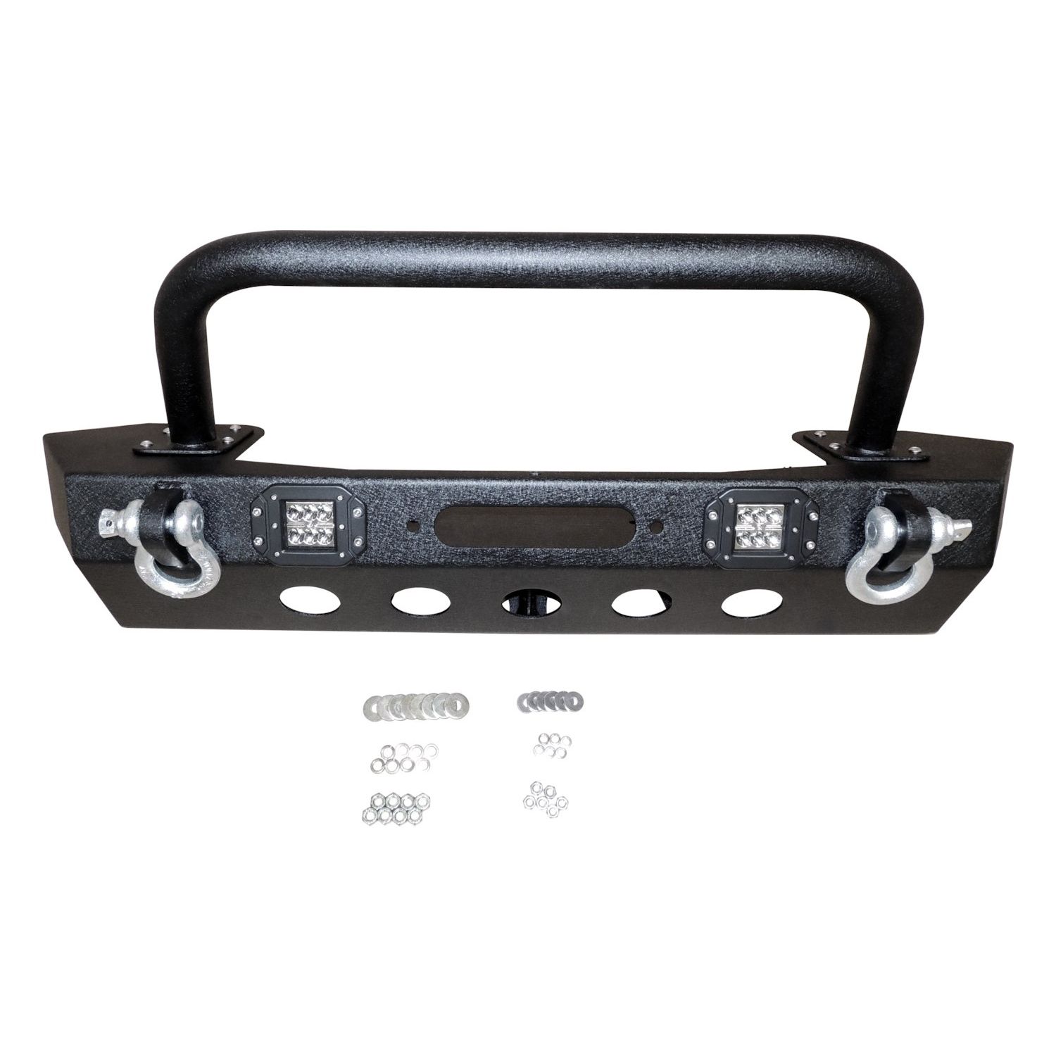 RT Off-Road's Heavy Duty Front Bumper is a heavy duty mid-width plate steel upgrade over the factory plastic bumper. The 3/16" plate steel and tubular steel construction is protected with a durable textured black powder coat. The mid width will drastically increase clearance on obstacles while off road as well as between the bumper and tire. The Bumper features a winch mount w/ fairlead mounting holes, D-Ring mounts with D-Rings, and additional holes for mounting lights. Installs into the factory bumper mounting locations using the included hardware. Does not require any drilling or modification.