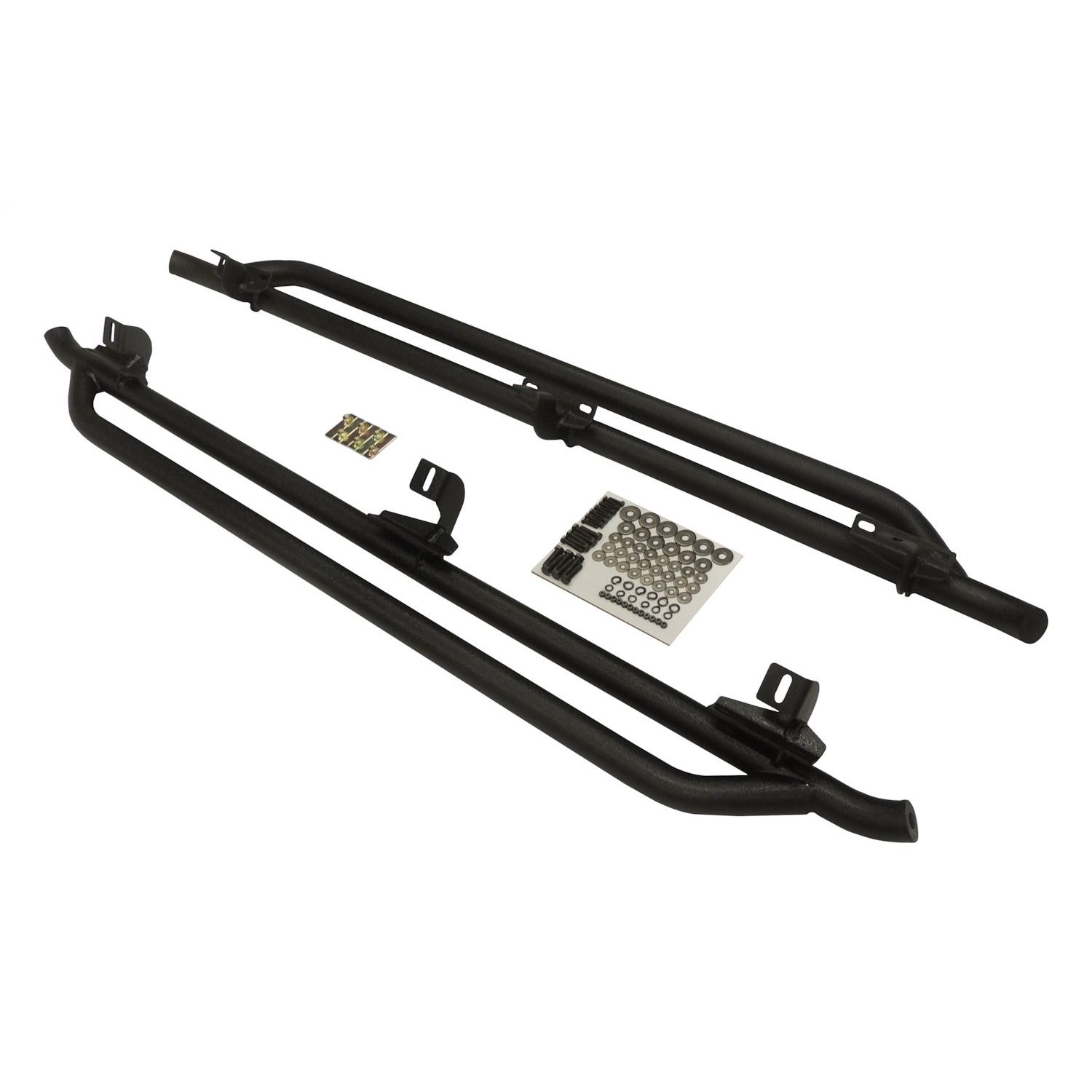 RT Off-Roads heavy duty rocker panel guard set is a required upgrade for serious rock crawling off-road enthusiasts. The heavy duty tube steel construction protects the vehicles rocker panels from rocks, trees, and all other obstacles one may encounter on the trail. They are protected with a textured black powder coated finish that will provide years of protection. Kit includes both driver and passenger side rocker panel guards, all hardware needed to install, and installation instructions.