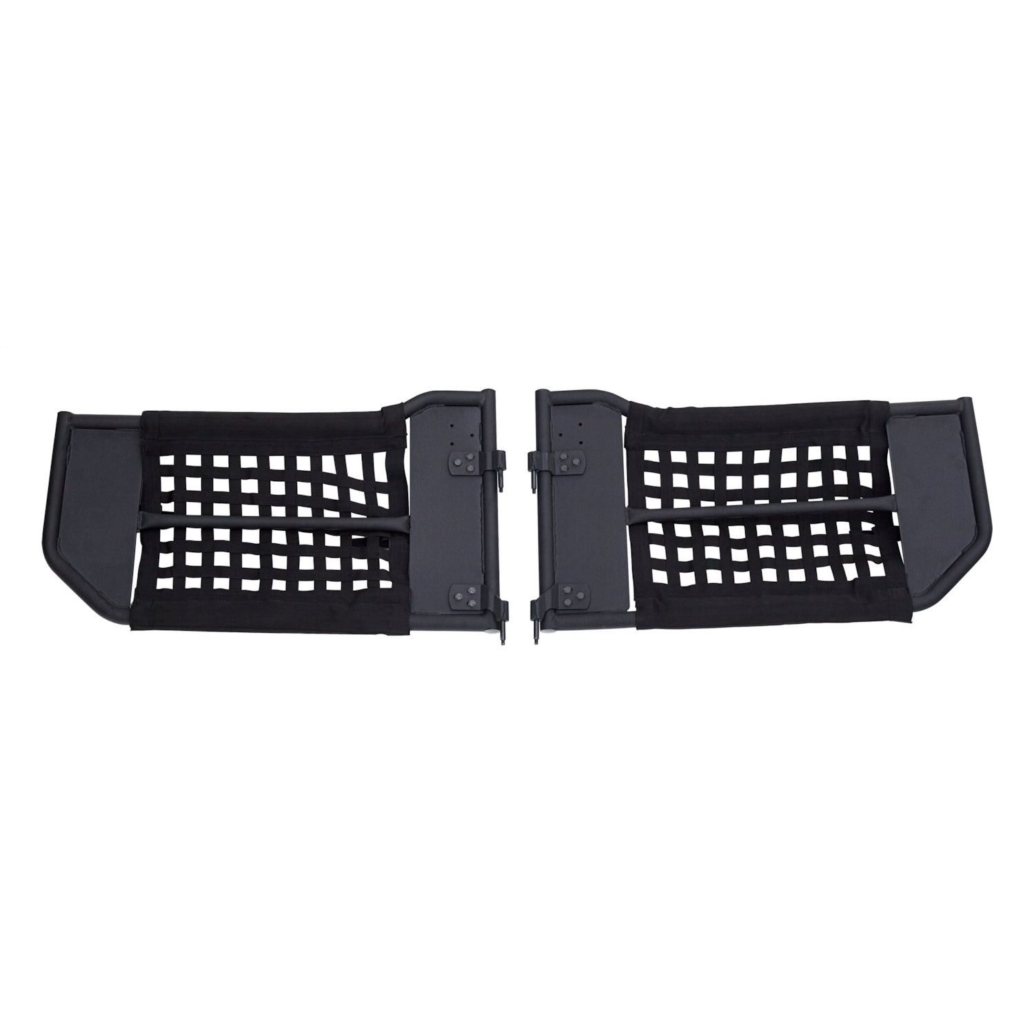RT Off-Roads Tube Door Set is a perfect compromise to the safety doors provide and the open air feel of driving doorless. The doors are manufactured of 1-1/4" steel tubing and coated in a textured black powder coat finish. Included with the doors are nylon netting for increased safety and a safari-style look. They are pre-drilled to accommodate TJ Wrangler mirrors and include adjustable hinge pins and latch plates.