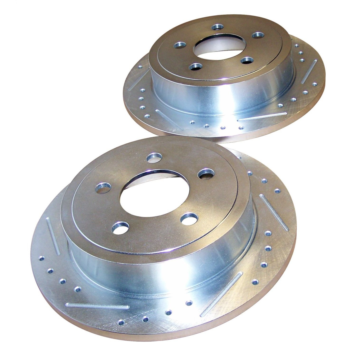 RT Off-Road's Cross-Drilled and Slotted Brake Rotors are manufactured to improve upon the shortcomings of OE brake rotors. They feature cross-drilling and slotting which improves heat dissipation and greatly reduces brake fade. The addition of the channels and holes also allow the heat, gasses, and debris that are byproducts of hard braking to dissipate more rapidly. This results in lower rotor temperatures which reduces the chances of warping while providing increased braking performance. Each rotor is designed to replace OE parts without the need for added shims, brackets, or spacers.