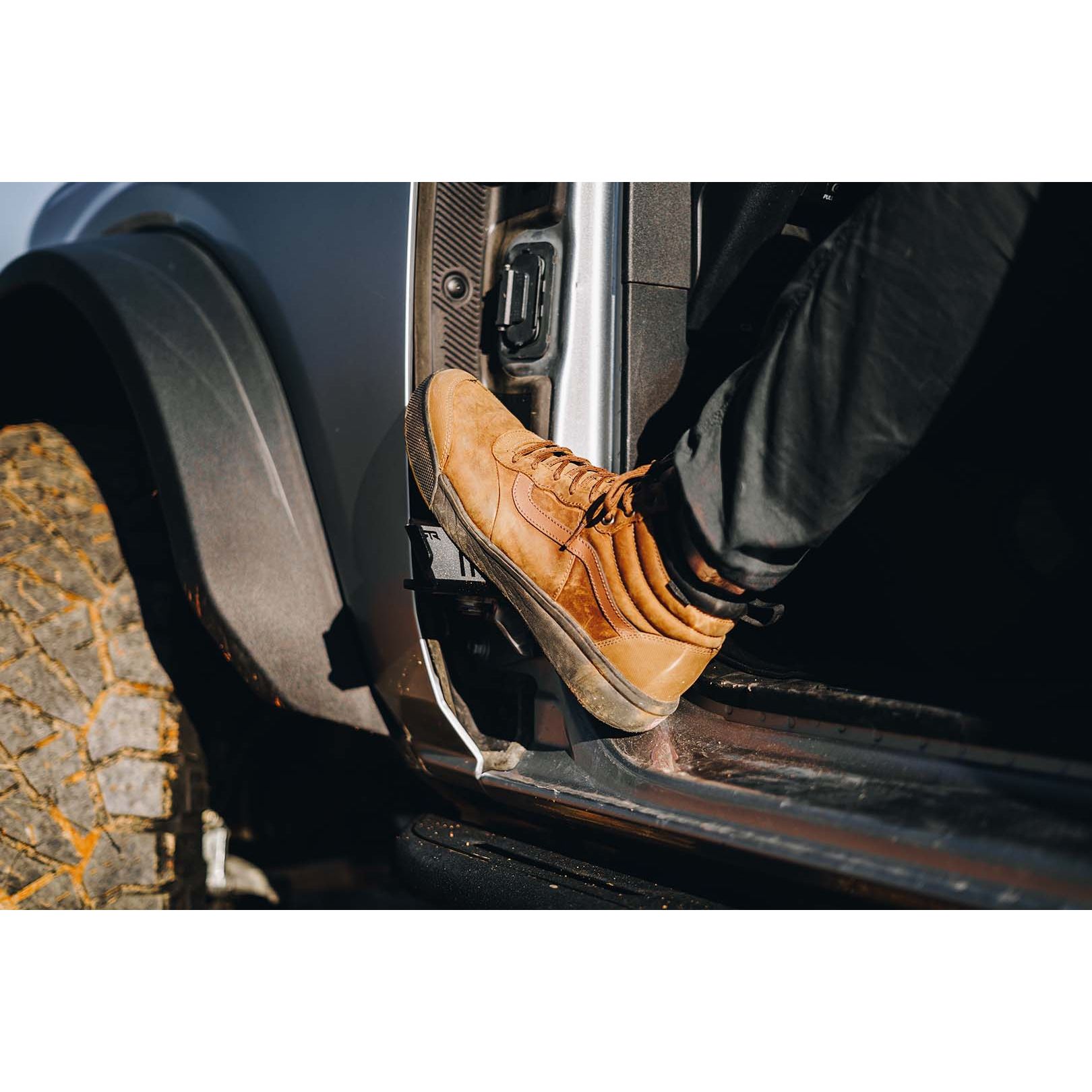 Modern Aggressive RTR Styling. With a unique design that plays off the factory surfaces of your Bronco, you will find the RTR Bronco Foot Rests stand out from anything else on the market. No fake bolts here, only modern, aggressive RTR styling. High-Quality Construction. The RTR Bronco Foot Rests are designed and manufactured with consideration of OEM fitment.These foot rests are designed to have a tight, quality fit on your Bronco door hinges. These foot rests can rotate in for added side clearance when needed. The RTR Bronco Foot Rests have a durable, powder-coated finish and grip tape to ensure foot doesn't slip. Simple, Straight Forward Installation. The RTR Bronco Foot Rests are designed using OE Manufacture CAD data and is installed with high-quality hardware and mounting points. There is no cutting or modification required for a clean, straight forward installation. Made in the USA. RTR Bronco Foot Rests are proudly designed and manufactured in the United States.