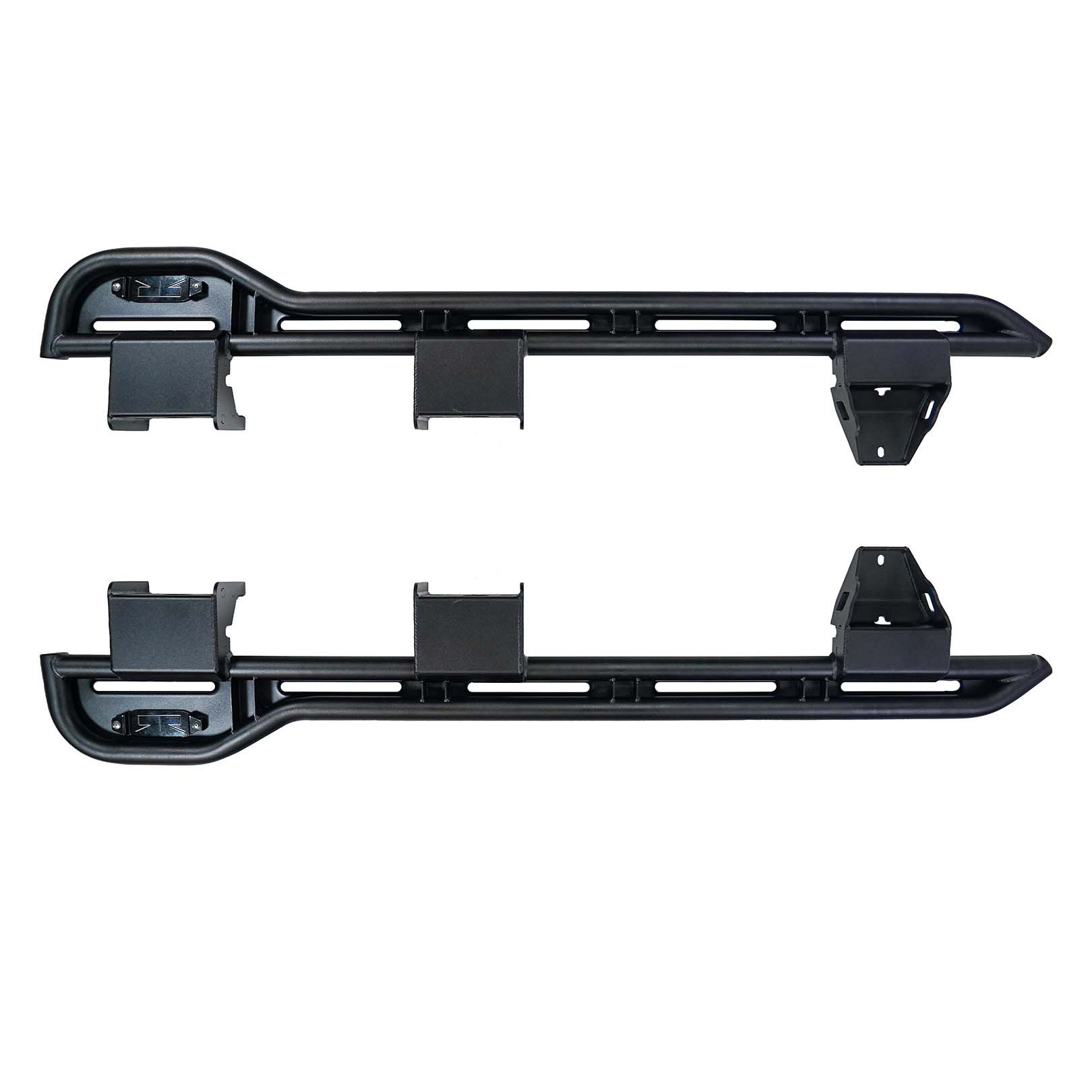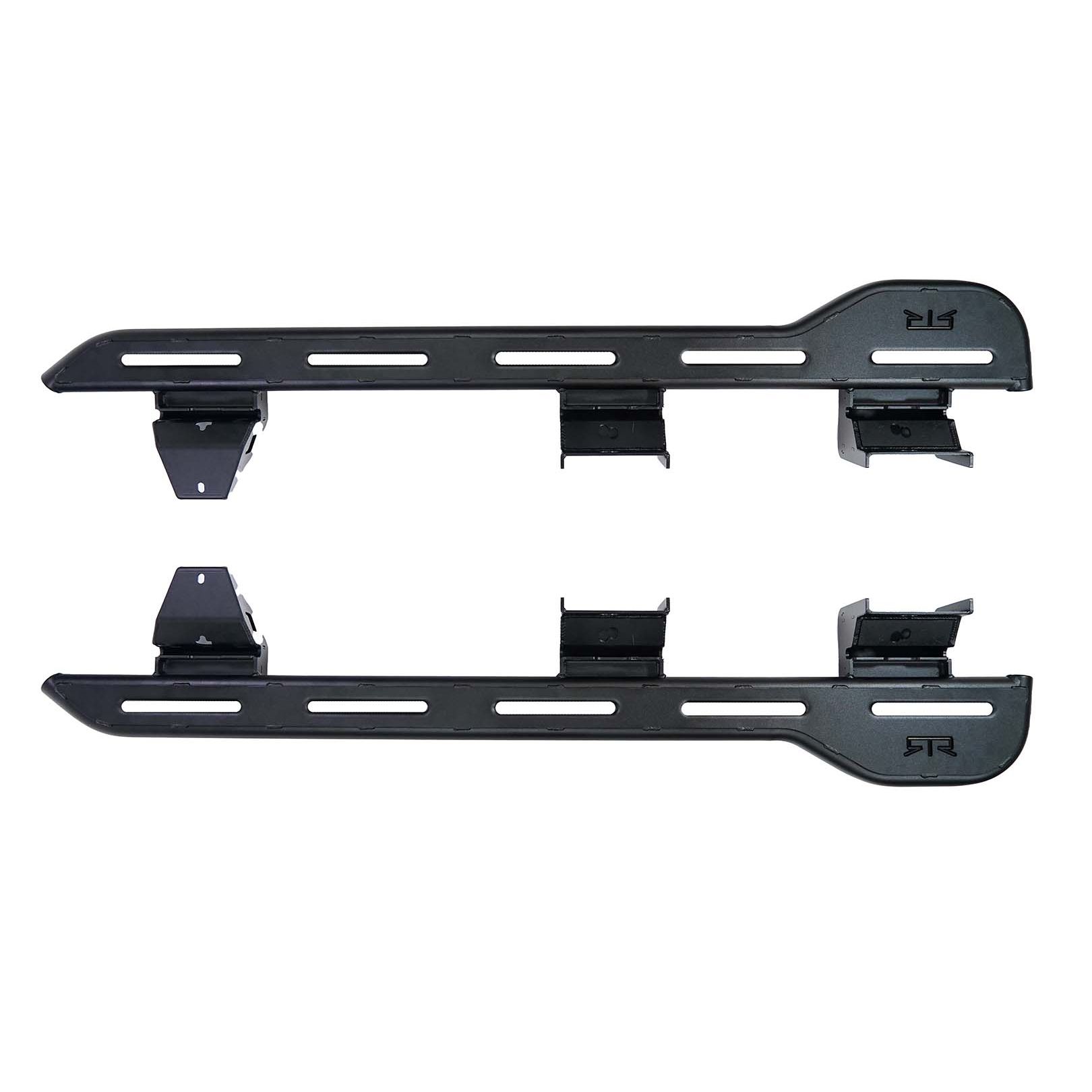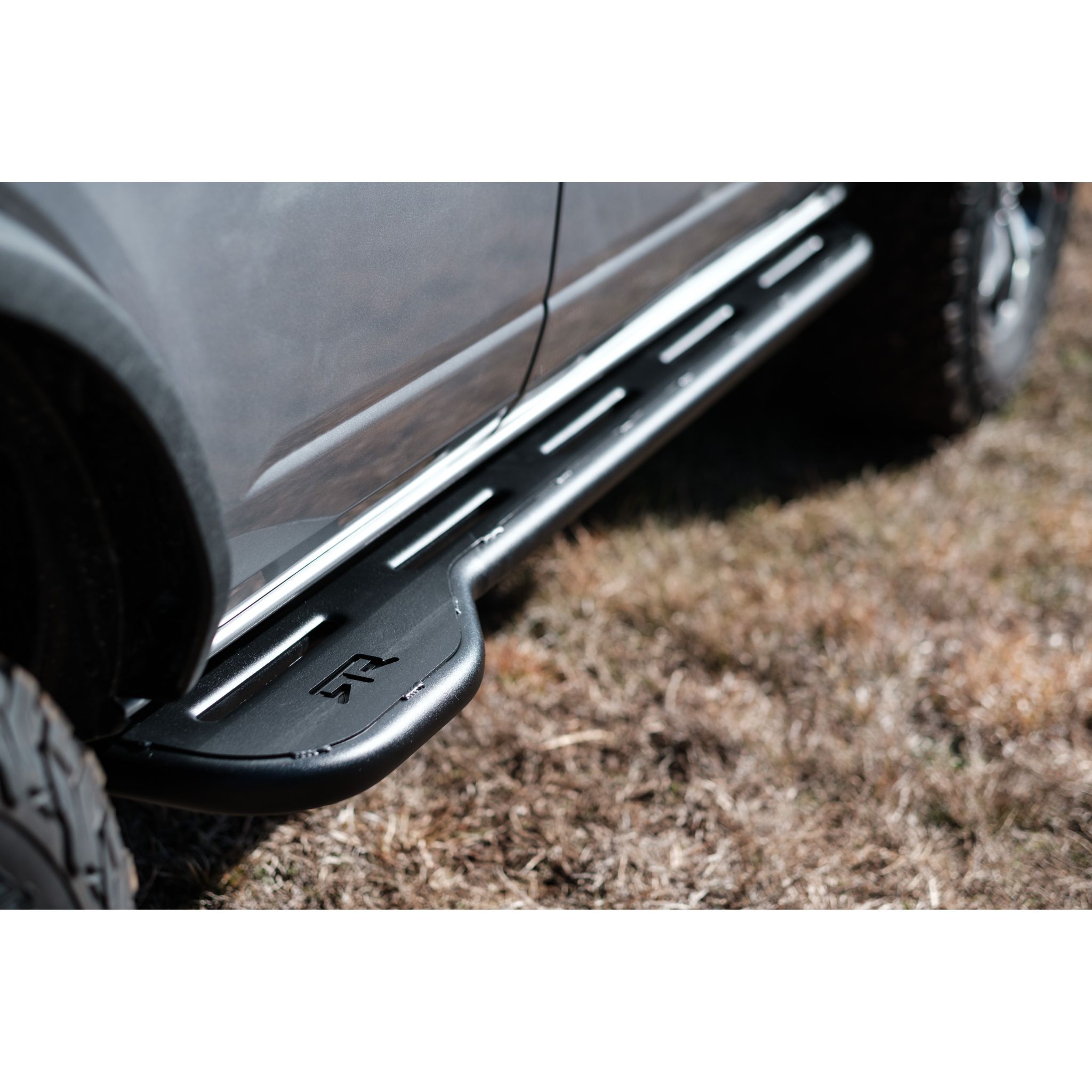 Modern Aggressive RTR Styling. With their structural tubular design, Bronco RTR Rock Sliders are built to perform under the most rigorous conditions, adding a functional lift point and 4 inches of step to your Bronco. Bronco RTR Rock Sliders feature a 7 inch rear kick out that helps you slide across larger obstacles and doubles as a step to help you reach your gear mounted on your roof. Bronco RTR Rock Sliders stand out from anything else on the market. No fake bolts here, only modern, aggressive RTR styling. High-Quality Construction. The Bronco RTR Rock Sliders are made from heavy gauge 1.75-inch DOM steel tubing and come standard with a 2-stage textured black powder-coated finish for grip. The Bronco RTR Rock Sliders also feature heavy-duty steel plate mounts for the trails ahead. Simple, Straight Forward Installation. The Bronco RTR Rock Sliders are designed using OE CAD data. The Rock Sliders install with stock hardware and mounting points. There is no cutting or modification required for a clean, straight-forward installation. Made in the USA. The Bronco RTR Rock Sliders are proudly designed and manufactured in the United States.