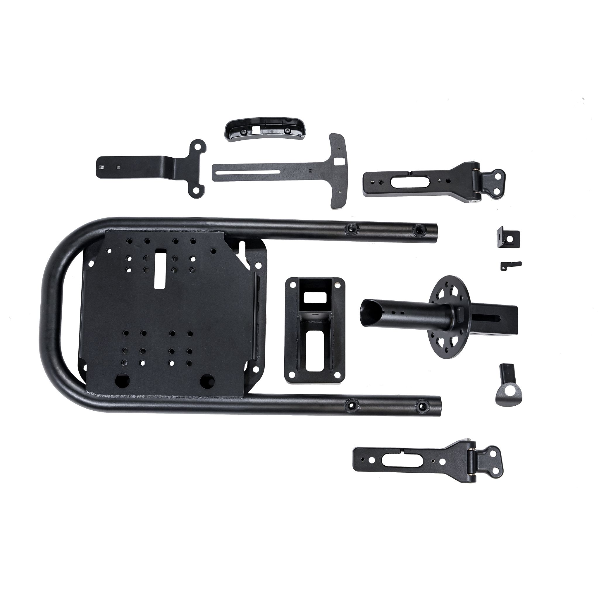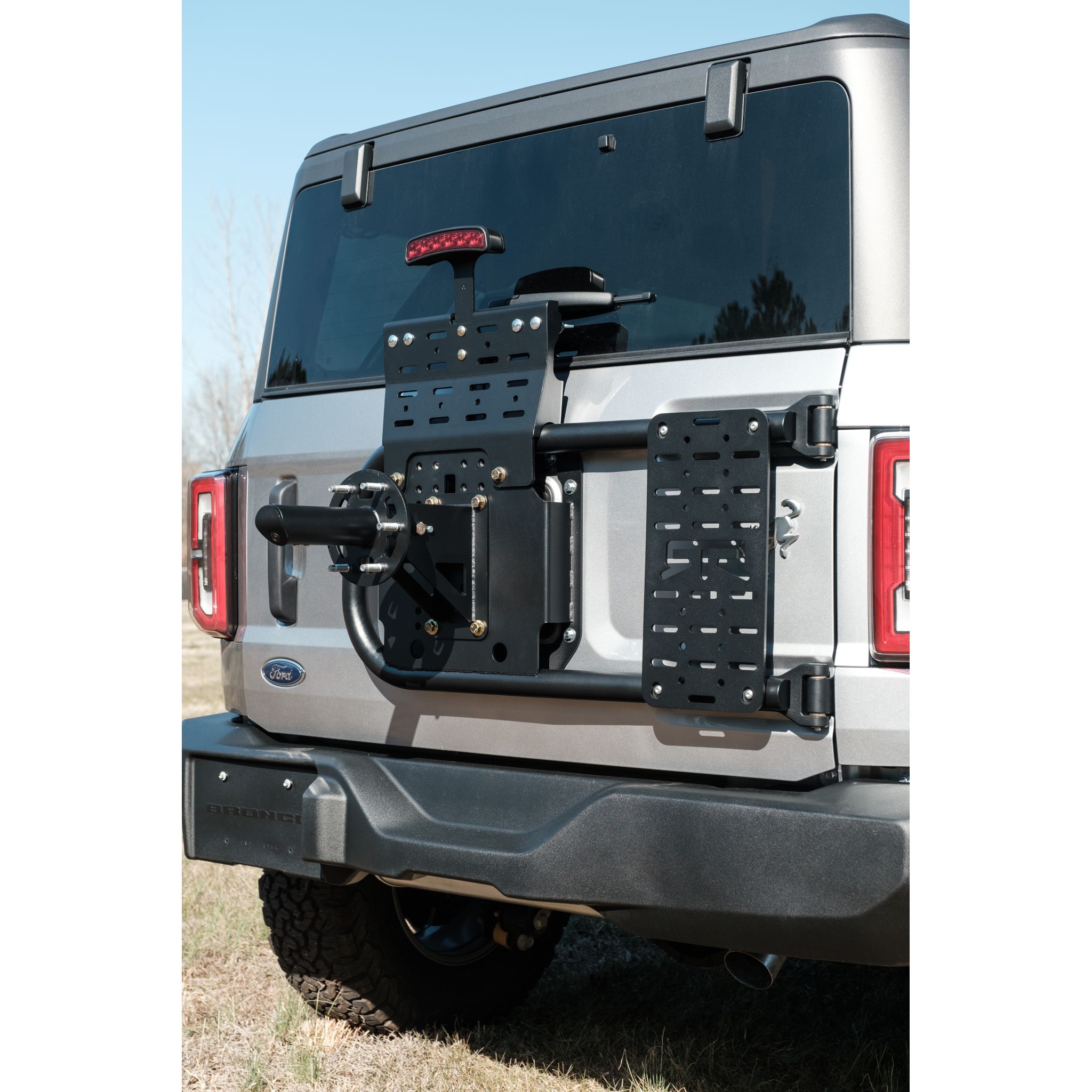 Modern Aggressive RTR Styling. The Bronco RTR Spare Tire Carrier was designed with off-road enthusiasts in mind. With large spare tire mounting, fitment for OE back up camera, and a modular design for additional RTR accessories, the Bronco RTR Spare Tire Carrier is trail ready without compromise. Spline nuts are included for additonal security on and off the trails. No fake bolts here, only modern, aggressive RTR styling. High-Quality Construction. The Bronco RTR Spare Tire Carrier is made from heavy gauge 1.75-inch DOM steel tubing and comes standard with a black powder-coated finish for added grip. This spare tire carrier is adjustable in horizontal, vertical, and depth positions. Simple, Straight Forward Installation. The Bronco RTR Spare Tire Carrier is designed using OE CAD data. The spare tire carrier installs with the OE mounting points so there is no cutting or permanent modification required for a clean, straight forward installation.