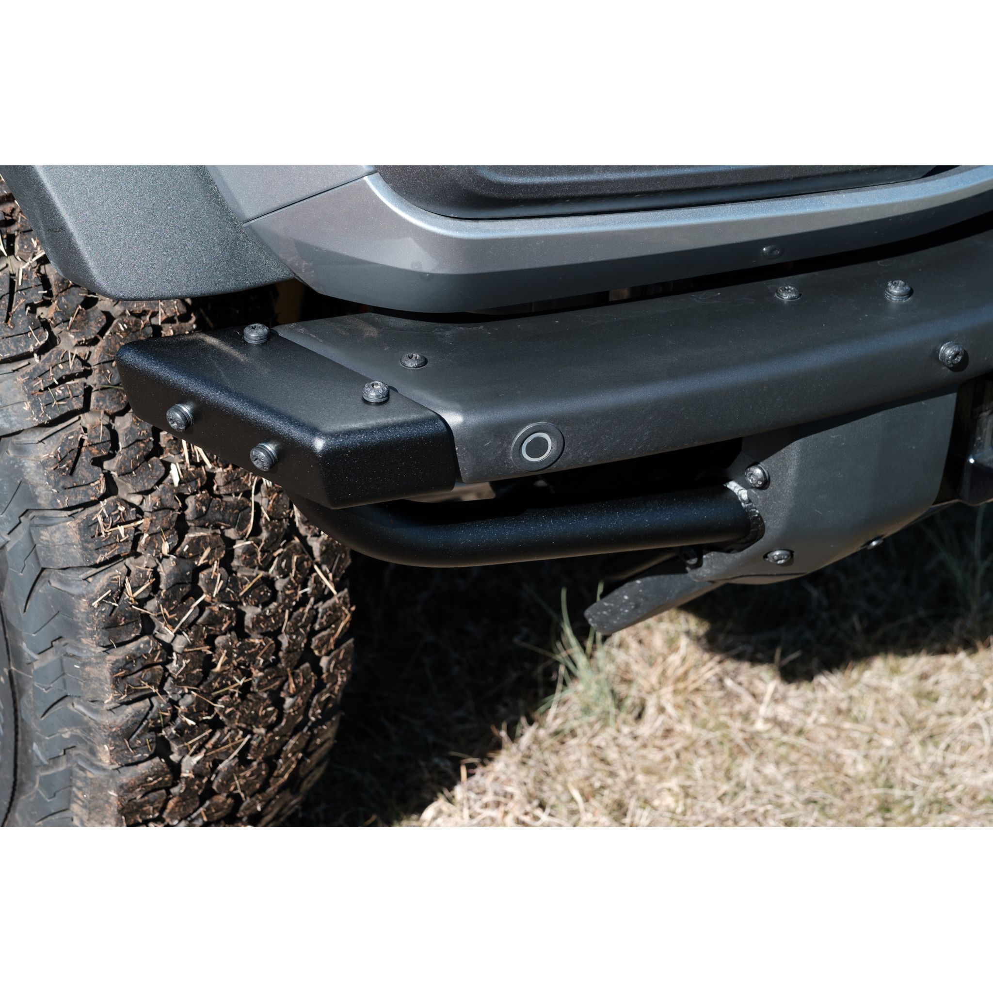 RTR Modern Aggressive Styling and Tactical Performance. With a unique functional design, you will find the RTR Tubular Front Bumper End Caps are unlike anything else on the market. They attach directly to the modular Bronco bumper. Simple, Straight Forward Installation. Designed using OE CAD data, the RTR Front Bumper End Caps install with same mounting points as OEM modular bumper corners. There is no cutting or modification required for a clean, straight forward installation. Application. RTR Tubular Front Bumper End Cap is designed to fit all 2021+ Bronco trim levels equipped with a modular bumper. It does not fit the standard bumper. Made in the USA. RTR Tubular Front Bumper End Caps are proudly designed and manufactured in the United States.
