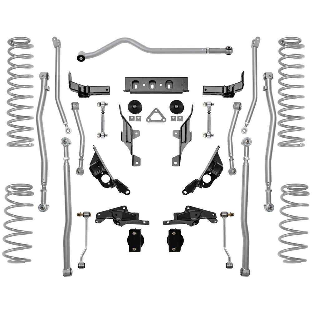 The latest addition to the Rubicon Express JL suspension offering is our complete 4-Link Extreme-Duty Long Arm system. These high performance suspension systems deliver both performance and control that are unmatched by any other long arm kit on the market. They feature adjustable Chromoly upper and lower control arms that will stand up to anything you can drive over. With PT-MEG Super-Ride Bushings and Super-Flex Joints they are sure to provide superior handing while not limiting articulation. The kit's FULL WIDTH heavy-duty transmission crossmember allows for more durability and frame rigidity then the competition. This also allows for installation that is much easier that competitors kits eliminating the need for welding. An optional robust belly pan, and CNC machine steering knuckle provide outstanding upgrades. Systems can be ordered in 3.5" or 4.5" lift heights. Like all Rubicon Express systems, they are made in the USA and backed by the Rubicon Express Advantage Lifetime Warranty.