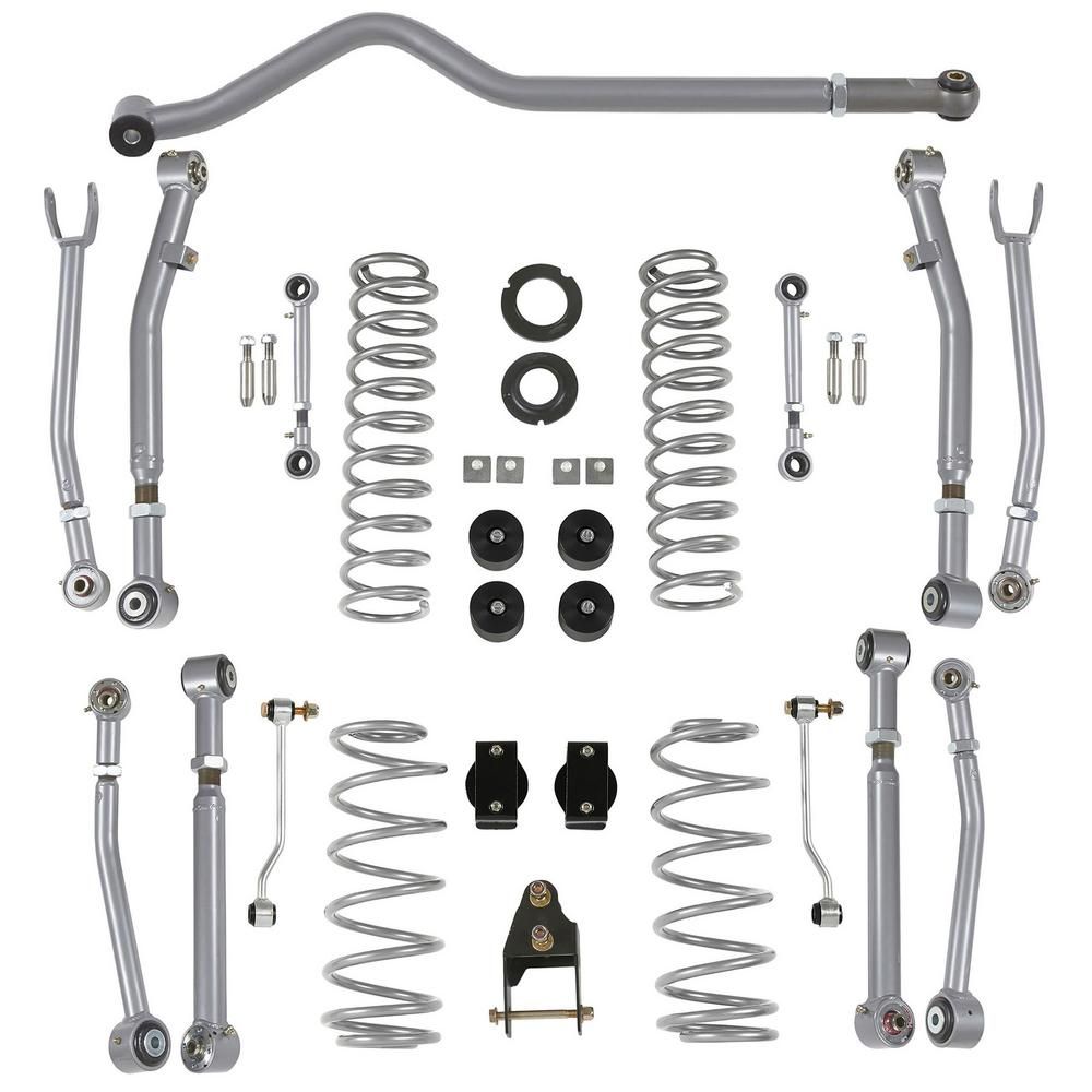 THE RUBICON EXPRESS 3.5"/ 4.5" SUPER-FLEX SUSPENSION SYSTEM FOR THE JL OWNER WHO WANTS A MORE AFFORDABLE PRICE. THE LOWER CONTROL ARMS OF YOUR JLS SUSPENSION ARE UPGRADED WITH OUR SUPER-FLEX FRONT CONTROL ARMS WHILE THE STOCK UPPER CONTROL ARMS ARE RETAINED. THE 3.5"/4.5" SUPER-FLEX SYSTEM WILL IMPROVE THE TRAIL FLEXIBILITY OF YOUR JL WHILE RETAINING A COMFORTABLE STREET RIDE.