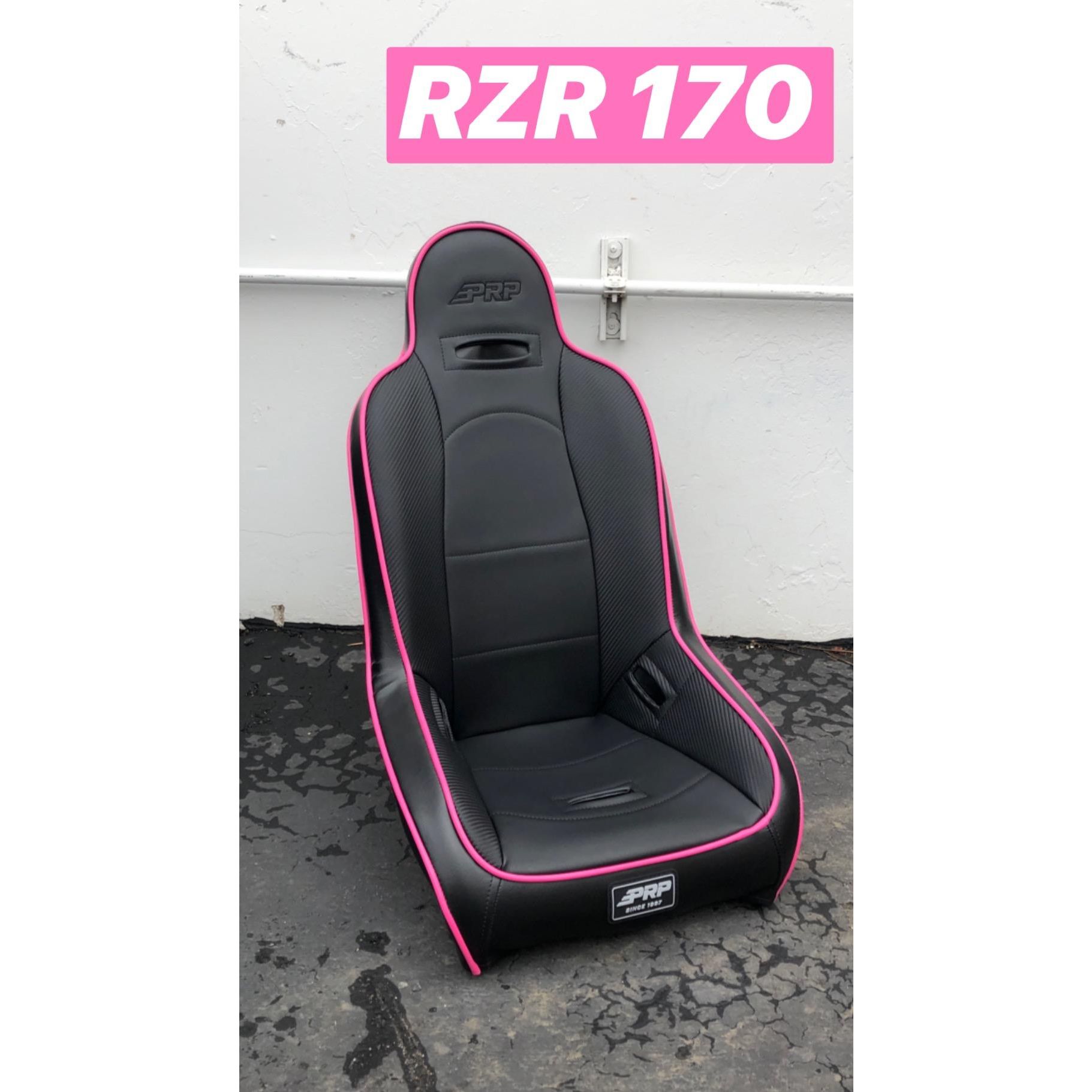 PRP's RZR 170 Seat is designed for smaller riders who want to add some extra comfort and containment to their ride. The medium height containment on the sides of the seats keeps little ones secure in the seat when bouncing around rough terrain, while still being easy to get in and out of the vehicle. That containment keeps their body from sliding around in the seat, and allows them to maintain better control on the wheel while driving through rough terrain. So they can drive with confidence that they'll stay secure in the seat no matter what the yard or trails throws at them. Add more comfort to their ride! PRP's 170 Seat features a suspension liner and dual-density foam that decreases the impact on the body, and provides a ton of extra comfort and support versus the stock seats. The seat is best fit for smaller rider sizes approx 6-12. Includes a 5th point slot in the seat to run harnesses through. Seats are sold individually. The seat is designed to bolt directly into the Polaris RZR 170 or Ranger 150 – but features a flat mounting straps on the bottom so that it can be used universally in other vehicles as a jump seat. Design your own and Make it Yours! With over 60+ different colors and materials to choose from, you can customize the perfect seat for your ride. Extra options available include Front Goggle Pockets, Rear Storage Pockets, Water Paks, Heated Seats, Air Lumbar, and various Diamond Stitches. Don't forget to grab harnesses! This seat is not compatible with the stock 3pt seat belts in the 170. We also encourage the use of aftermarket harnesses for the increased safety they offer. PRP highly recommends our 4.2 Harness, since it features an auto buckle that is easier for most smaller riders to click in and out of. Also check out PRP's GT3 Mini Seat for the RZR 200 which is slightly larger. Proudly Made in the USA. Installation: Driver seat bolts directly to RZR 170 & Ranger 150 stock slider. Passenger seat includes square tube brackets that ar