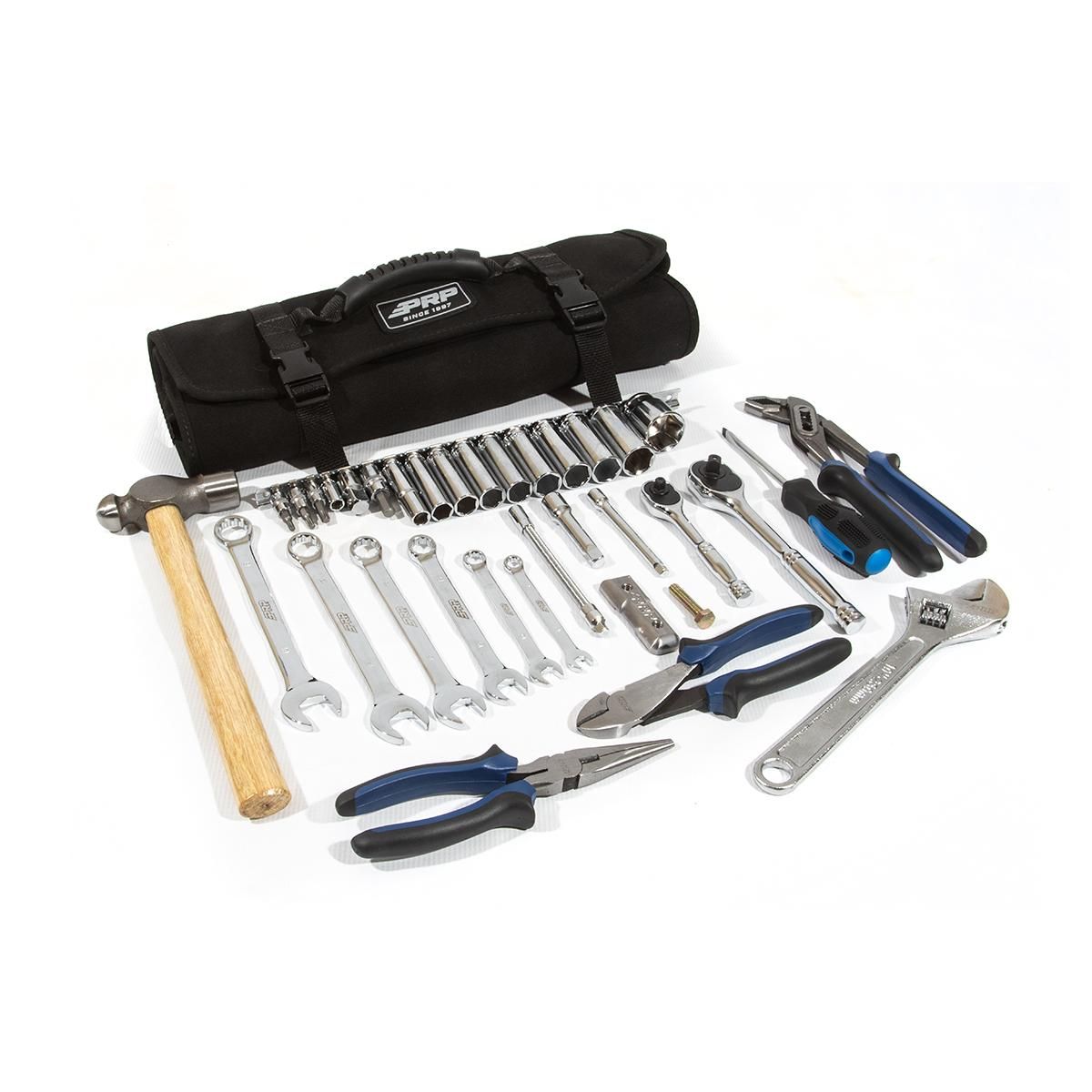 PRP's Polaris RZR Roll-Up Tool Kit provides everything you need to fix your RZR out on the trail. This 38-piece kit includes a selection of high-quality ratchets, sockets, wrenches, extension bars, pliers, and a ball peen hammer. We have hand-picked the tools most commonly needed when working on a Polaris RZR so you'll have the essentials that you need! Made from extremely durable twill material, the Polaris RZR Roll-Up Tool Kit makes it easy to keep everything neat and organized. The bag is made from extremely durable twill material, features heavy duty buckles, and has an easy to carry grab handle. A zippered pocket holds all the sockets you'll need and any other tools you want to bring with you. The tool bag can be mounted, or stored securely inside the vehicle. The roll-up style bag makes it quick and easy to grab out of the vehicle when you need it, and the tools inside don't make noise when bouncing around the trails. This kit also comes with PRP’s RZR Belt Changing Bolt for Turbo, Turbo S, RS1, PRO XP, PRO R, PRO S and Turbo R’s. Rather than using the L shaped clutch wrench that’s included in the stock tool kit (where you have to spin it by hand a thousand times), you can simply insert this hardened bolt, and use a ratchet (or impact) to tighten it down in seconds. The bolt holds the secondary clutch open, so you can quickly and easily change a belt in seconds, rather than minutes Don't get caught out on the trail unprepared. PRP's Roll-Up Tool Kit has everything you need to get your RZR going! Plus, each tool also includes a Limited Lifetime Warranty! Testimonial "This tool burrito is the product I end up using the most, and has pretty much everything you need to work on a RZR. I know that, because I've broken almost everything on a RZR." – Aaron Vehicle Fitment Polaris RZR 200 / 570 / 800 / 900 / XP1000 / Turbo / Turbo S / RS1 / PRO XP / PRO R / PRO S / Turbo R / Trail / EXPEDITION Kit Includes 1- Flat Head screwdriver – Hose clamps 1- Groove jo