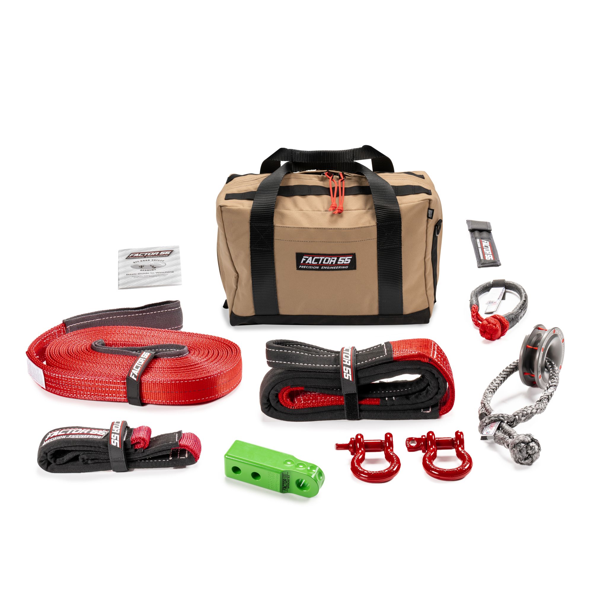 Sawtooth Kit is our medium recovery gear kit and includes: two 3/4? red Crosby Shackles, 10? Extreme Duty Soft Shackle, 10? Standard Duty Soft Shackle, Shorty Strap II, Tree Saver, HitchLink 2.0, Standard Duty Tow Strap, RRP, Fast Fid, Basic Guide to Winching, three strap wraps, all packed into a Factor 55 Recovery Gear Bag