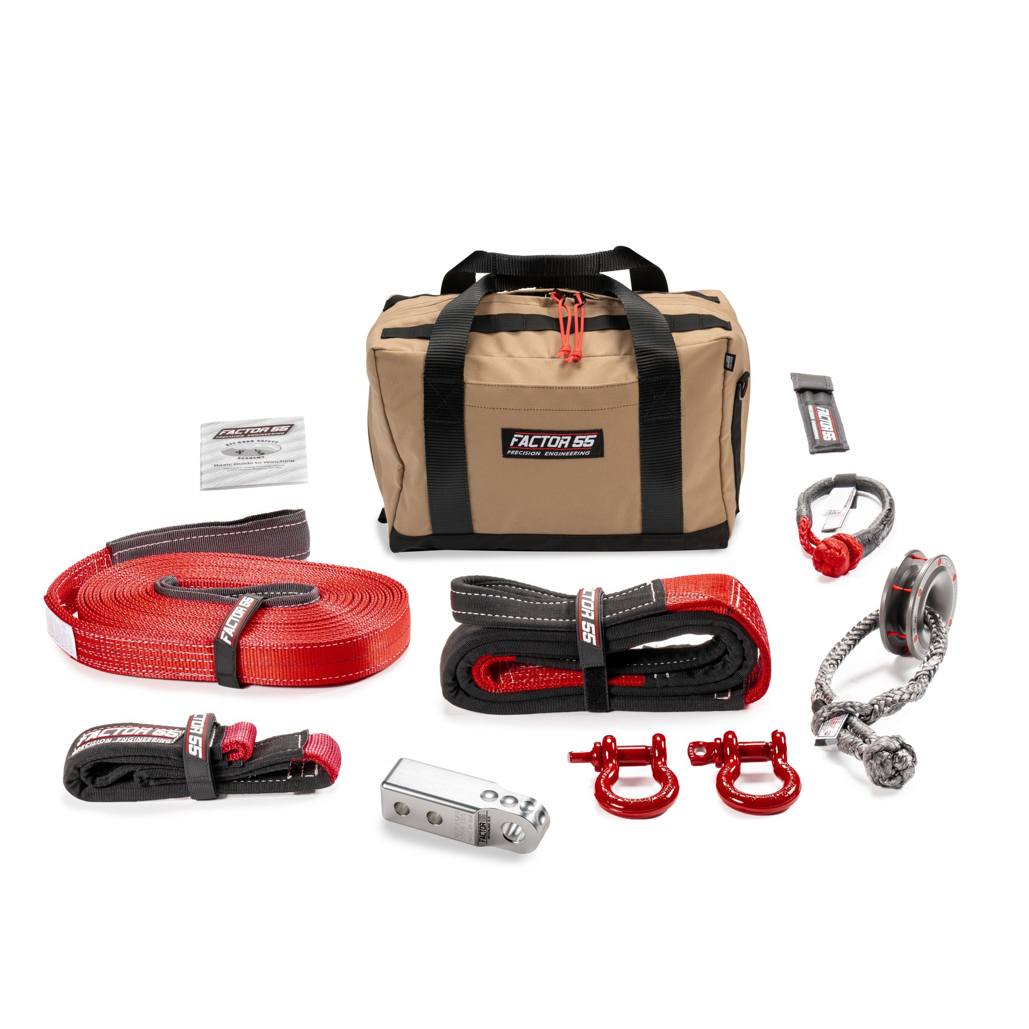 Sawtooth Kit is our medium recovery gear kit and includes: two 3/4? red Crosby Shackles, 10? Extreme Duty Soft Shackle, 10? Standard Duty Soft Shackle, Shorty Strap II, Tree Saver, HitchLink 2.0, Standard Duty Tow Strap, RRP, Fast Fid, Basic Guide to Winching, three strap wraps, all packed into a Factor 55 Recovery Gear Bag