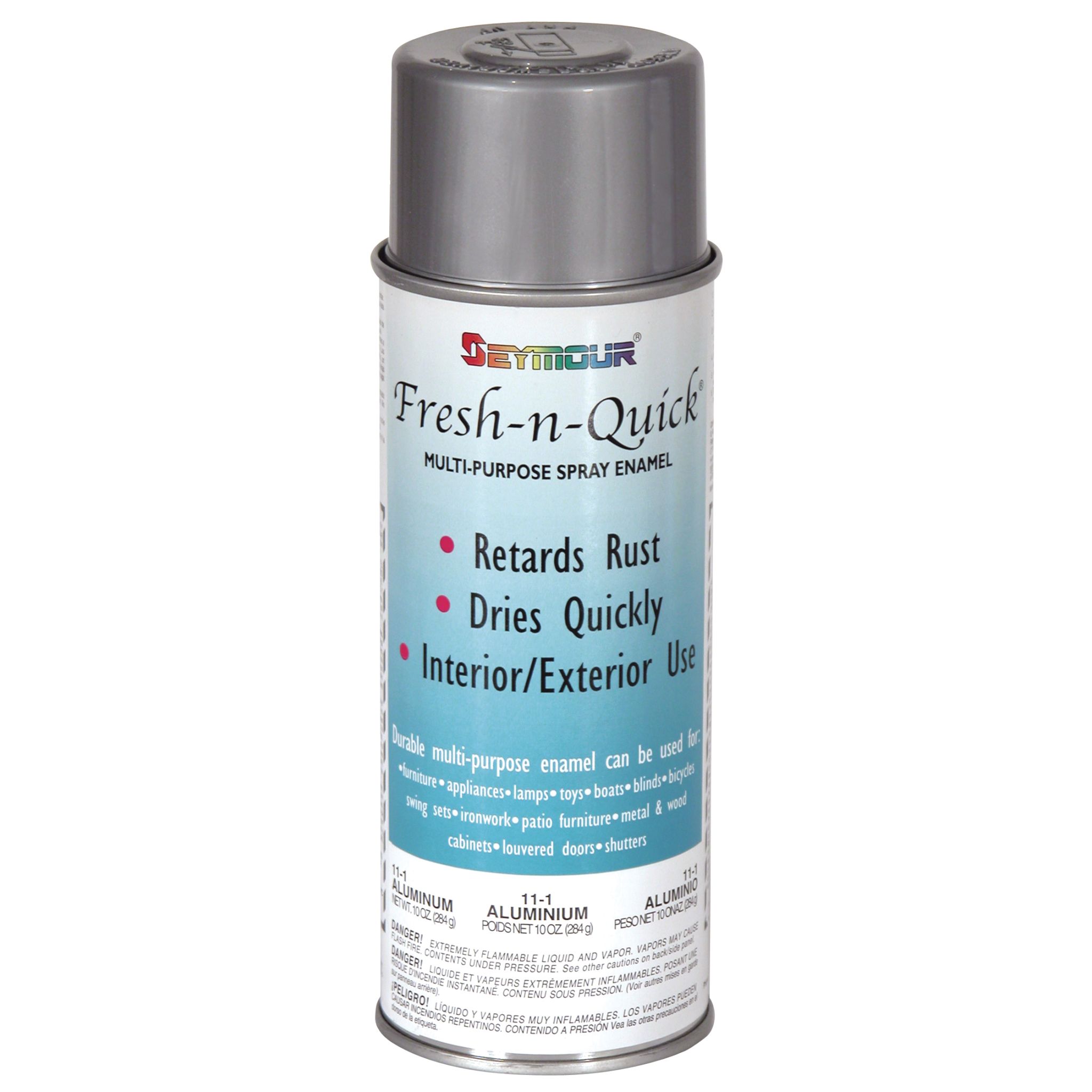A high quality spray paint available in a wide range of popular colors and economically priced. Black and white available in a gloss or flat finish. It covers well, dries fast, and holes up well outdoors. Bare or rusted surfaces should be cleaned and primed with Fresh-N-Quick Gray Primer (11-15).