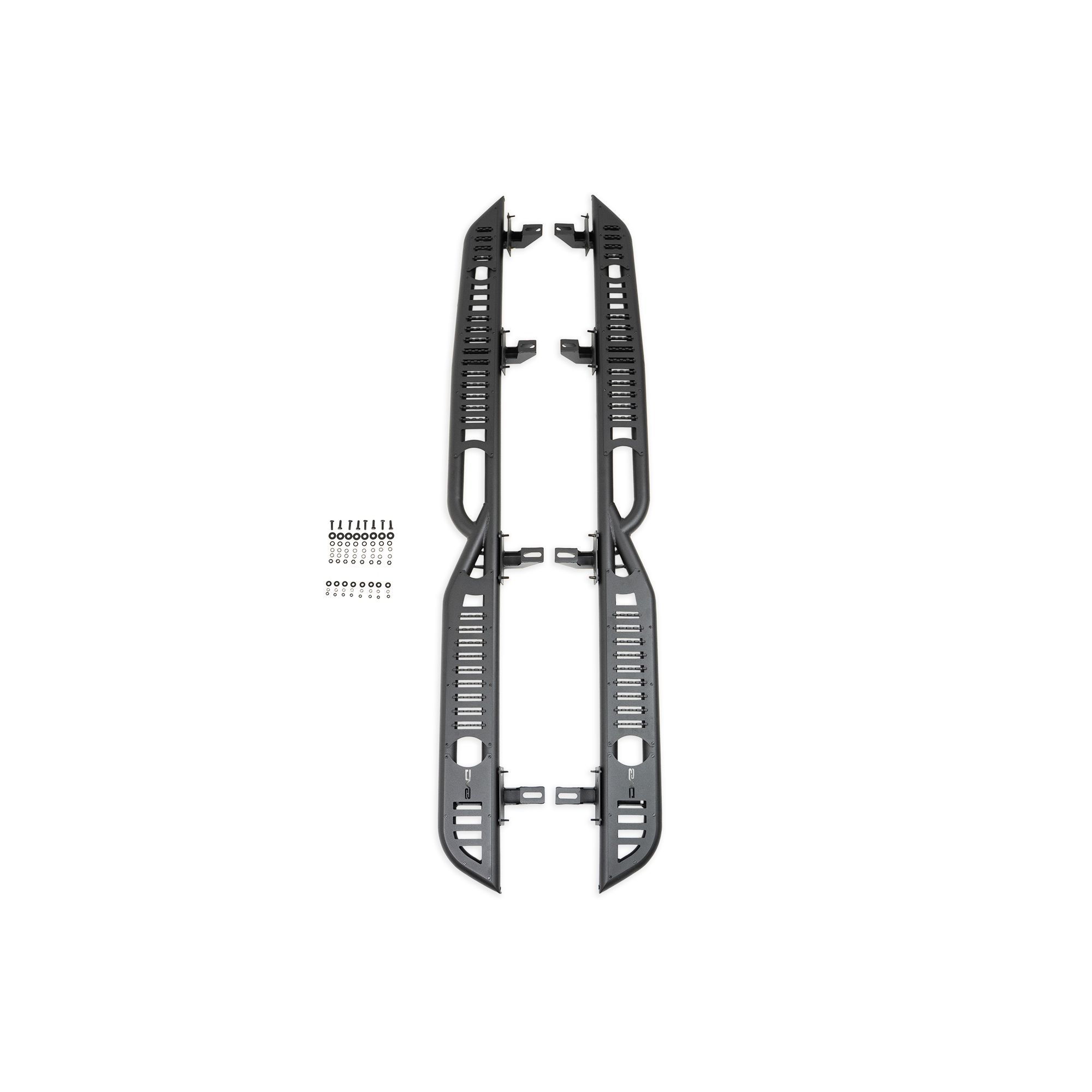 Our OE Plus Gladiator JT Side Steps provide a functional step up/down surface without a loss in ground clearance. The anti-slip step plates provide excellent grip, even when wet or muddy. Additionally, the steps protect against light debris such as small branches & rocks kicked up by the tires. A micro-texture black powder coat finish protects the steps from corrosion. The steps mount directly to the pinch weld, with some drilling required depending on the vehicle.