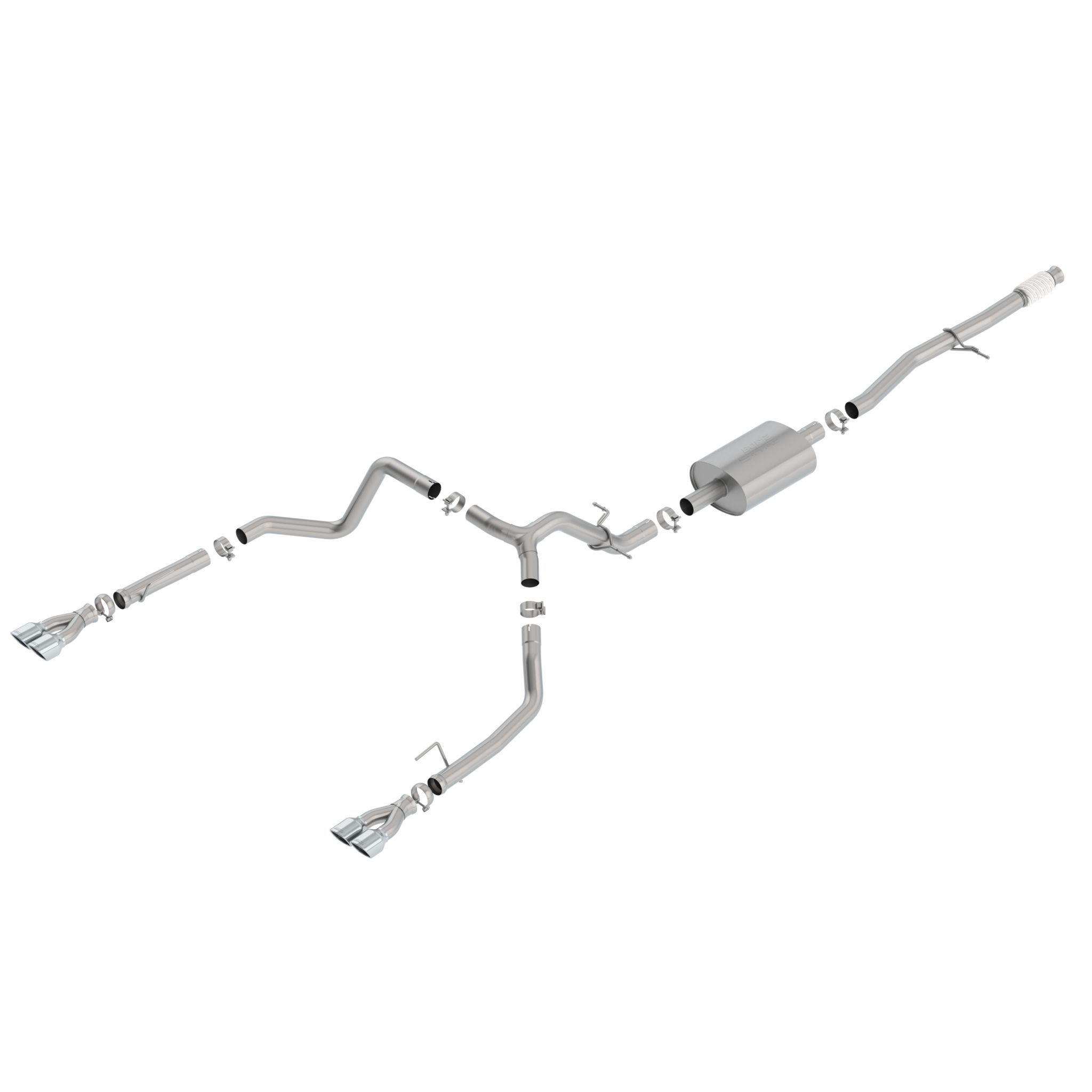 This 3" diameter into dual 2.75" Borla(r) Cat-Back(tm) system features the classic S-Type sound level with no drone inside the vehicle, and dual 3.5" X 3.28" "square" bright chrome on T-304 stainless steel tips on each tail pipe. Systems with black chrome on T-304 stainless steel tips and carbon fiber tips are also available. Installation REQUIRES removal of the Factory Valance Tips. Borla(r) Cat-Back(tm) & Axle-Back exhaust systems feature patented straight-through and multi-core technology designed to unleash hidden horsepower. Increased exhaust velocity adds power, driving excitement, fuel economy, and the distinctive Borla(r) Sound of Power respected by motoring enthusiasts everywhere. Each system is built from premium T-304 stainless steel, superior to T-400 series knockoffs (such as 409), to give you the absolute best in performance and durability. Ultra-smooth mandrel bends ensure maximum flow & power, and precision computer numerical control (CNC) manufacturing ensures an accurate fit. Give your Silverado or Sierra the power and sound they deserve, bolt on a Borla(r) . Best of all, Borla(r) stands behind every system with a Million-Mile Warranty. Just what you'd expect from the world's most experienced (and most winning) exhaust brand.