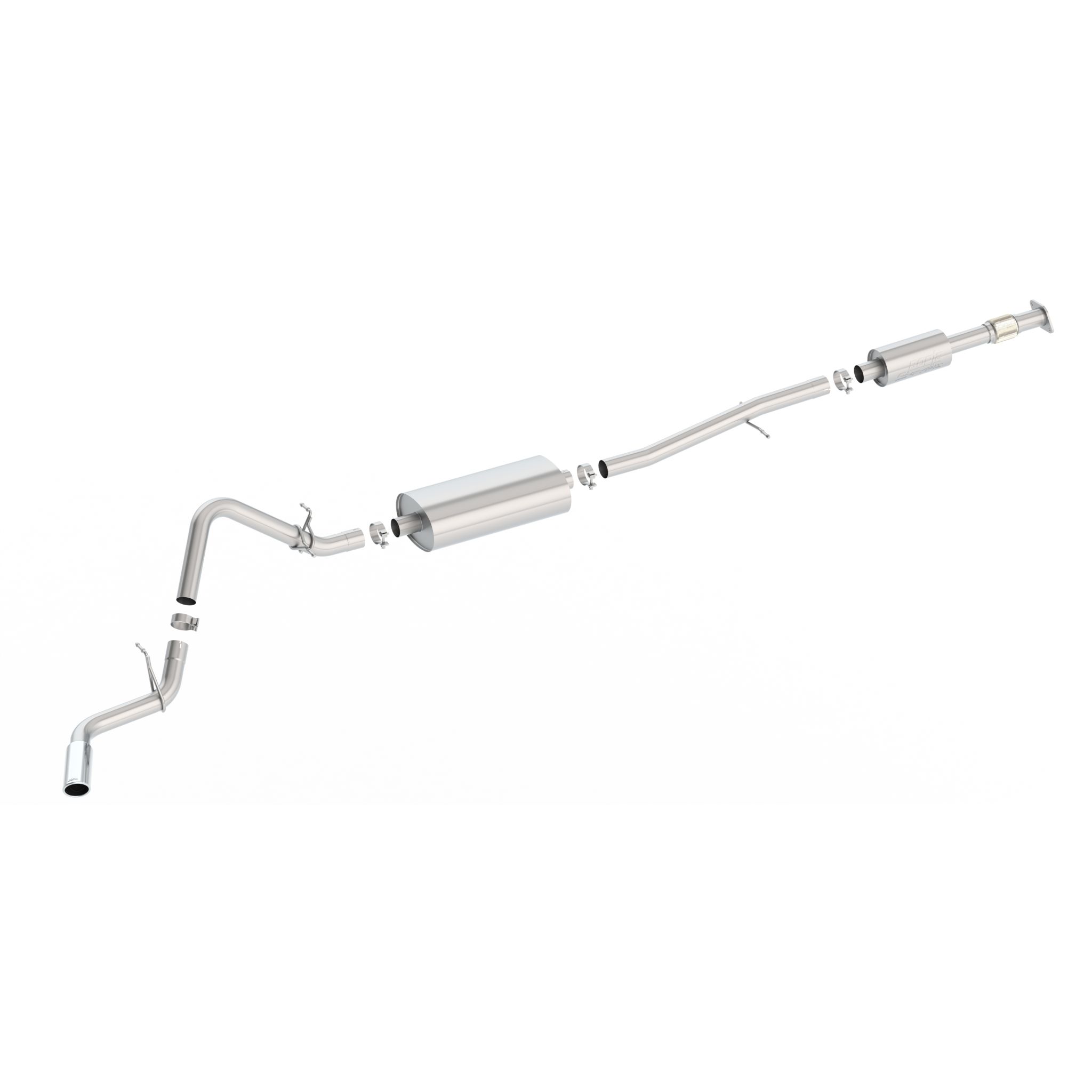 Factory Single Side Exit vehicles ONLY. Add Adapter 60708 For Crew Cab with Standard Bed (6' 7") 157" Wheelbase vehicles. This 3" Borla(r) Cat-Back(tm) system with the S-Type sound level will give your 2.7L Silverado and Sierra the right sound and performance without any of the annoying drone often found in four cylinder applications. The system is tuned for flow and sound on the turbo four cylinder engine of the GM 1500 trucks. This system features a single 4" bright chrome on T-304 stainless steel tip. A black chrome on T-304 stainless steel tip is also available. Borla(r) Cat-Back(tm) & Axle-Back exhaust systems feature patented straight-through and multi-core technology to unleash hidden horsepower. Increased exhaust velocity adds power, driving excitement, fuel economy, and the distinctive Borla(r) Sound of Power respected by motoring enthusiasts everywhere. Ultra-smooth mandrel bends ensure maximum flow & power, and precision computer numerical control (CNC) manufacturing ensures an accurate fit. The system is constructed using premium, high quality T-304 stainless steel which is superior to 400 series and is backed by the Borla(r) Million Mile Warranty.