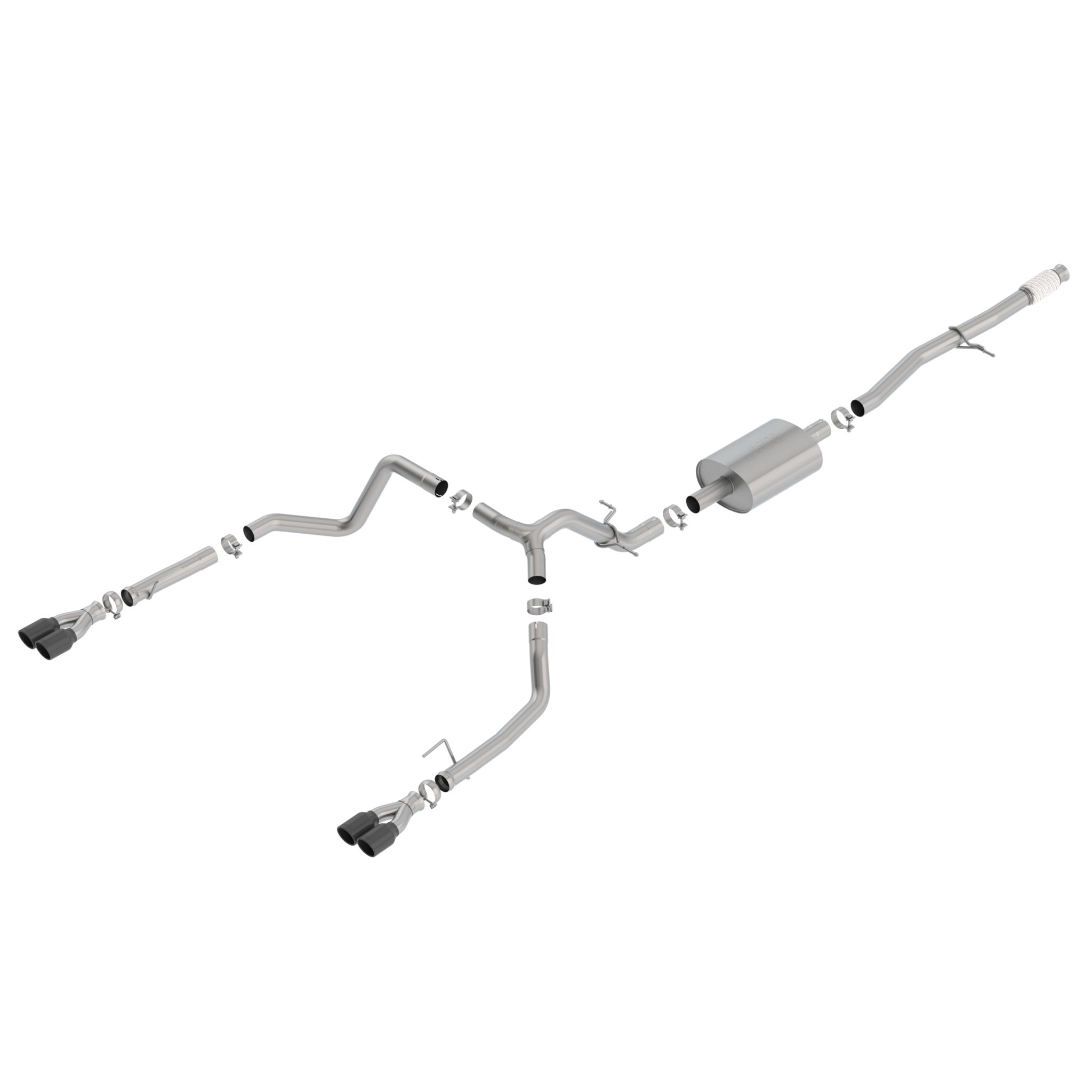 This 3" diameter into dual 2.75" Borla(r) Cat-Back(tm) system features the classic S-Type sound level with no drone inside the vehicle, and dual round 3.5" black chrome on T-304 stainless steel tips on each tail pipe. Bright chrome on T-304 stainless steel tips and carbon fiber tips are also available. Installation REQUIRES removal of the Factory Valance Tips. Using Borla(r) Stainless Steel Polish p# 21461 is NOT recommended with these black chrome tips. We suggest cleaning the tips with hot water and a microfiber cloth. Carbon fiber tips with bright centers are also available. Borla(r) Cat-Back(tm) and Axle-Back exhaust systems feature patented straight-through and multi-core technology designed to unleash hidden horsepower. Increased exhaust velocity adds power, driving excitement, fuel economy, and the distinctive Borla(r) Sound of Power respected by motoring enthusiasts everywhere. Each system is built from premium T-304 stainless steel, superior to T-400 series knockoffs (such as 409), to give you the absolute best in performance and durability. Ultra-smooth mandrel bends ensure maximum flow & power, and precision computer numerical control (CNC) manufacturing ensures an accurate fit. Give your Silverado or Sierra the power and sound it deserves, bolt on a Borla(r) . Best of all, Borla(r) stands behind every system with a Million-Mile Warranty. Just what you'd expect from the world's most experienced (and most winning) exhaust brand.