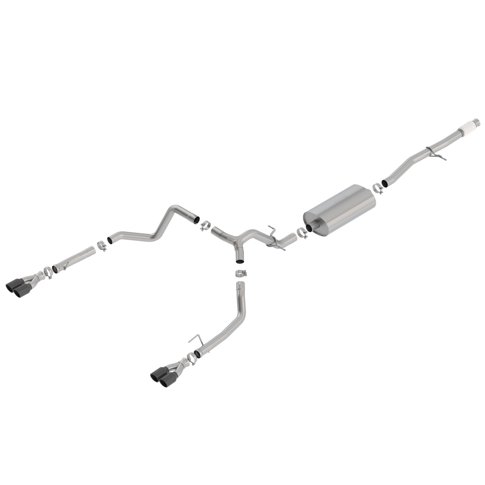 This 3" diameter into dual 2.75" Borla(r) Cat-Back(tm) system features the mellow Touring sound level with no drone inside the vehicle, and dual 3.5" round black chrome on T-304 stainless steel tips on each tail pipe. Bright chrome on T-304 stainless steel tips and carbon fiber tips are also available. Installation REQUIRES removal of the Factory Valance Tips. Using Borla(r) Stainless Steel Polish p# 21461 is NOT recommended with these black chrome tips. We suggest cleaning the tips with hot water and a microfiber cloth. Carbon fiber tips with bright centers are also available. Borla(r) Cat-Back(tm) and Axle-Back exhaust systems feature patented straight-through and multi-core technology designed to unleash hidden horsepower. Increased exhaust velocity adds power, driving excitement, fuel economy, and the distinctive Borla(r) Sound of Power respected by motoring enthusiasts everywhere. Each system is built from premium T-304 stainless steel, superior to T-400 series knockoffs (such as 409), to give you the absolute best in performance and durability. Ultra-smooth mandrel bends ensure maximum flow & power, and precision computer numerical control (CNC) manufacturing ensures an accurate fit. Give your Silverado or Sierra the power and sound it deserves, bolt on a Borla(r) . Best of all, Borla(r) stands behind every system with a Million-Mile Warranty. Just what you'd expect from the world's most experienced (and most winning) exhaust brand.