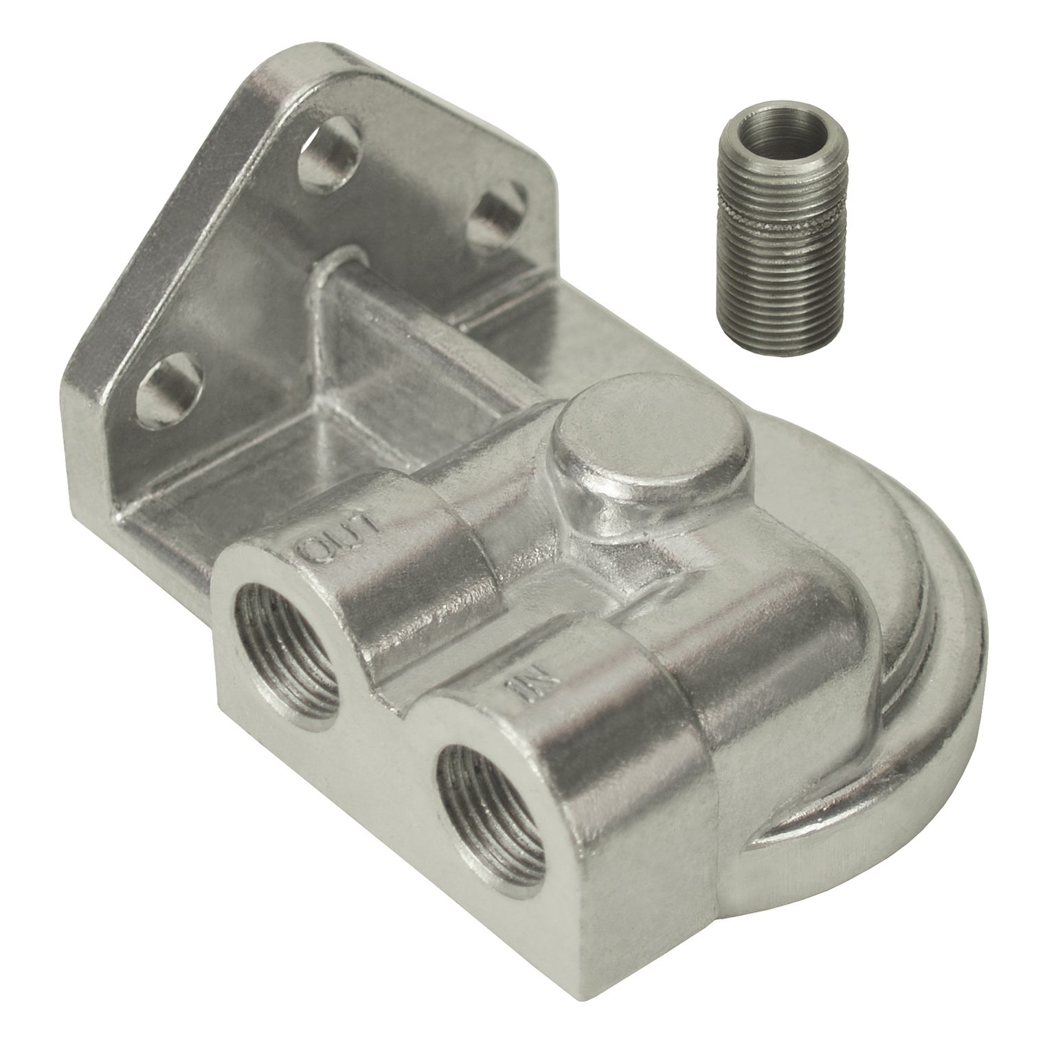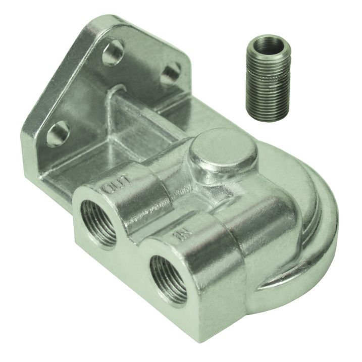 This new single remote filter mount is cast from high quality aluminum and features left only 1/2" NPT inlet and outlet ports and includes a 3/4"-16 threaded filter nipple.