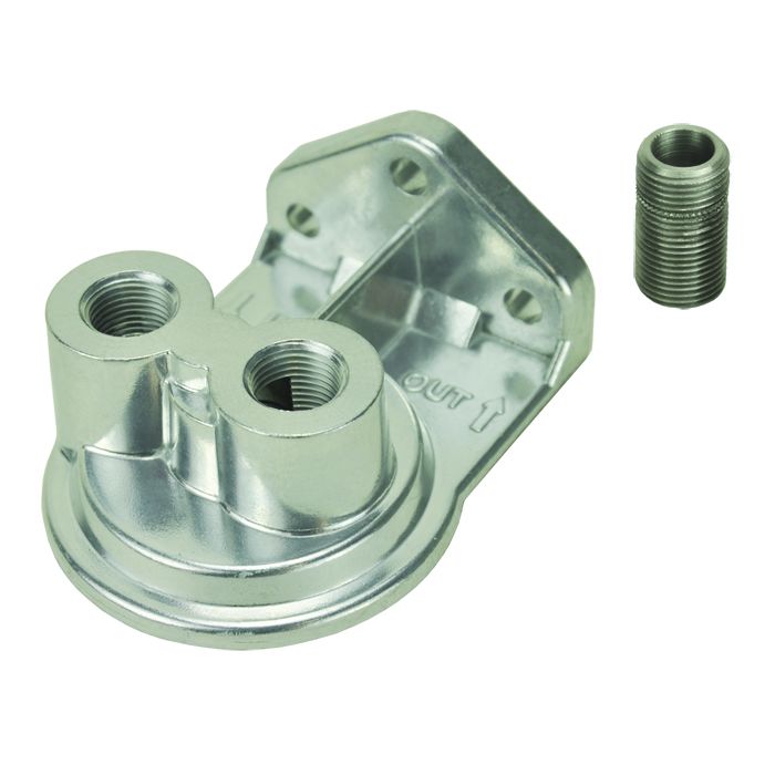 Die-cast from high quality aluminum, this single Remote Filter mount allows oil filter to be mounted anywhere space permits to allow quick and easy filter changes. A heavy duty three-hole mounting plate provides a solid mount and a new landing is provided for easier sensor/sending unit placement and avoiding interference with the 1/4" NPT inlet and outlet ports. Includes 3/4"-16 filter nipple only.