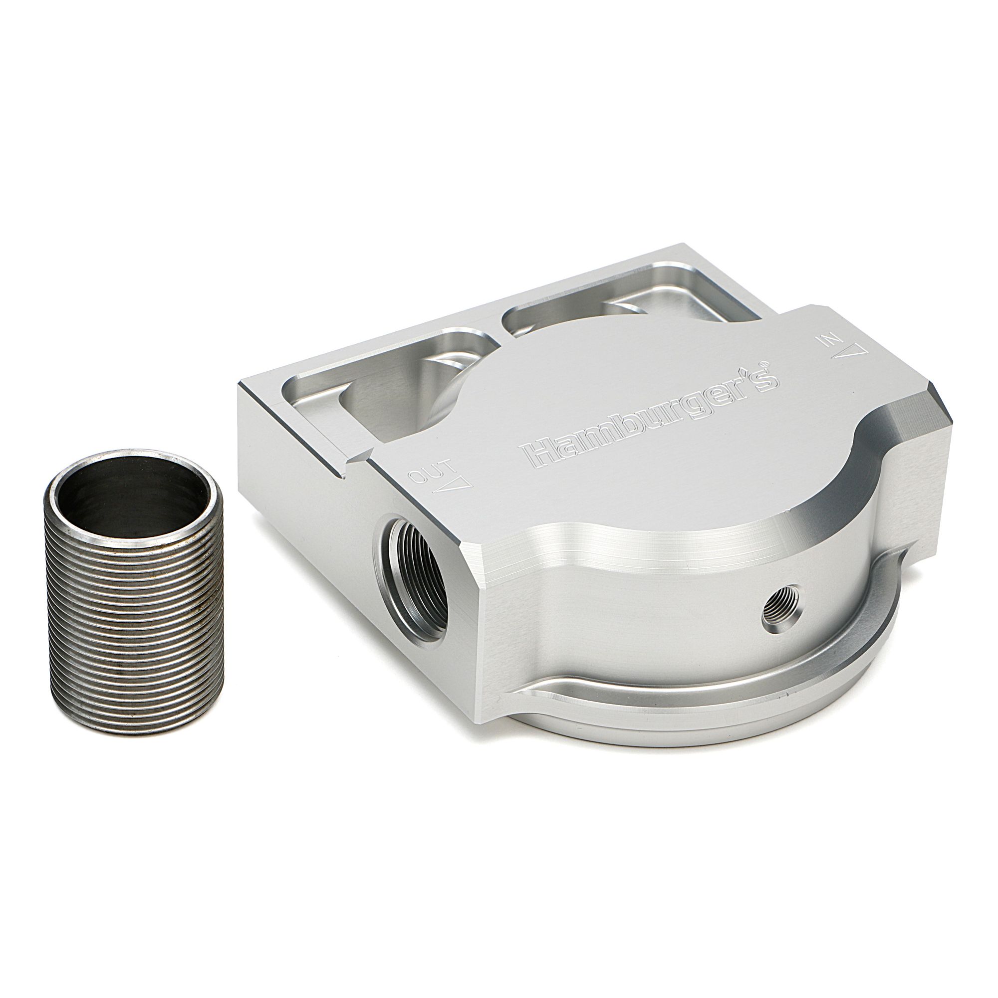 <p>This single, remote oil filter base is CNC machined by Hamburger's Performance Products in their Whittier, California manufacturing facility, and is so reliable, Hamburger's Performance backs it with a limited lifetime warranty.</p><p> Hamburger's remote oil filter bases are a must have for custom projects, such as, engine swaps and chassis modifications, that require the oil filter be removed from the block and relocated elsewhere. This unit is durable enough for marine or all-out competition use, and the dense billet aluminum material makes it ideal for diesel engines.</p><p>To accommodate the endless list of possible obstacles created during custom car build, Hamburger's is regularly introducing new options and design styles to its oil filtration component line. This model is configured for Right-To-Left oil flow, keeping the unit and inlet/outlet oil lines inline, to maintain a low profile along a fenderwell, framerail or firewall.</p><p>Engine oil enters through the right side of the unit, travels through the filter, and exits out the left side port on the unit. Large -12AN inlet and outlet ports means all Hamburger's oil filter bases and bypasses can provide ample flow to meet the needs of any car, truck or race engine. An 1/8" NPT instrumentation port has been built into the unit for pressure or temperature gauge. 1/8 in. NPT PLUG NOT INCLUDED.</p><p> The unit uses a Fram HP6, Mobil M1-302, Motorcraft FL-12, NAPA 1060, STP S5, WIX 51060, or equivalent oil filter with a 1-1/2"-12 thread size, 4" diameter seal, and bypass setting that matches your engine's factory filter setting.</p><p>This base reqquires a pair of oil lines and bypass adapter to complete the installation. If you do not already have these components, Hamburger's offers this base as part of complete filter relocation system that includes a filter bypass adapter, Gates hoses, fittings, ferules and the rmote base.</p><p>CNC machined from 6061 T6 aluminum, and includes a 1-1/2"-12 nipple.</p>