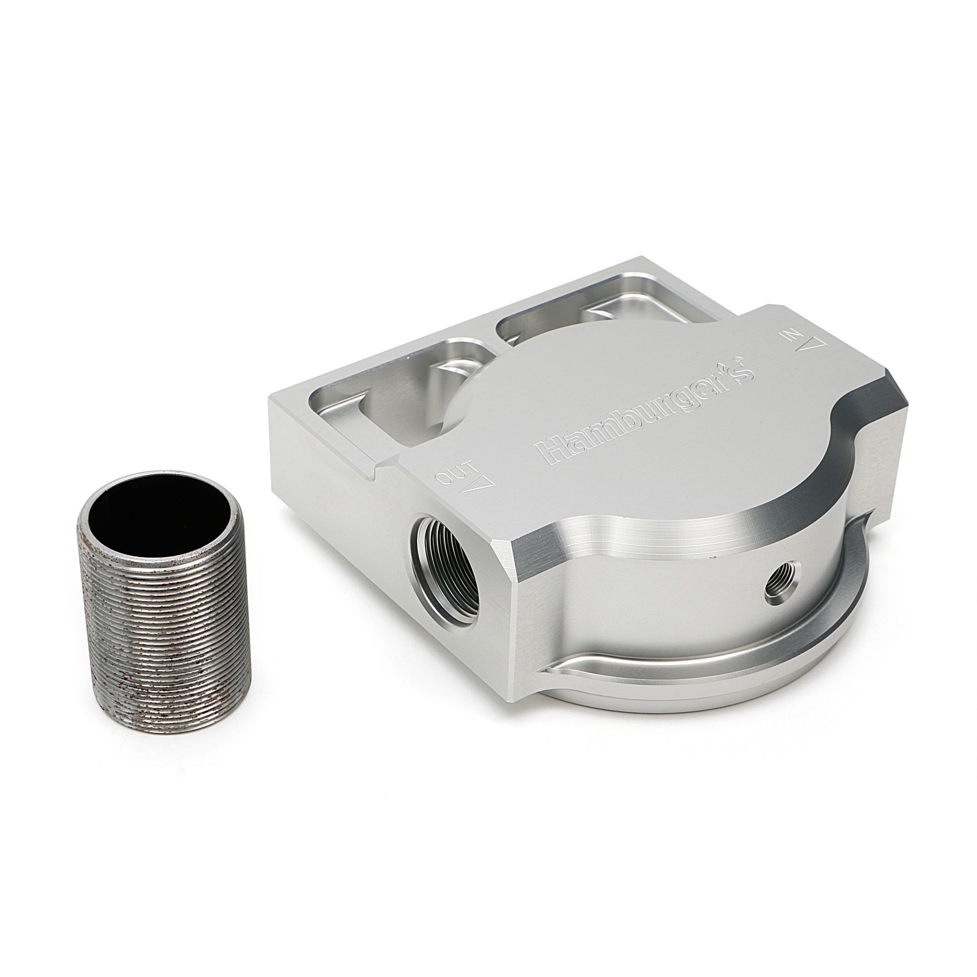 <p>This single, remote oil filter base is CNC machined by Hamburger's Performance Products in their Whittier, California manufacturing facility, and is so reliable, Hamburger's Performance backs it with a limited lifetime warranty.</p><p> Hamburger's remote oil filter bases are a must have for custom projects, such as, engine swaps and chassis modifications, that require the oil filter be removed from the block and relocated elsewhere. This unit durable enough for marine or all-out competition use, and the dense billet aluminum material makes it ideal for diesel engines.</p><p>To accommodate the endless list of possible obstacles created during custom car build, Hamburger's is regularly introducing new options and design styles to its oil filtration component line. This model is configured for Right-to-Left oil flow, keeping the unit and inlet/outlet oil lines inline, to maintain a low profile along a fenderwell, framerail or firewall.</p><p>Engine oil enters through the right side of the unit, travels through the filter, and exits out the left side port on the unit. Large -12AN inlet and outlet ports means all Hamburger's oil filter bases and bypasses can provide ample flow to meet the needs of any car, truck or race engine. An 1/8" NPT instrumentation port has been built into the unit for pressure or temperature gauge. 1/8 in. NPT PLUG NOT INCLUDED.</p><p> The unit uses a Fram PH3786, Mobil M1-601, Motorcraft FL-1995, NAPA 1734, STP S3786, WIX 51734, or equivalent oil filter with a 1-1/2"-16 thread size, 3.75" diameter seal, and bypass setting that matches your engine's factory filter setting.</p><p>This base requires a pair of oil lines and bypass adapter to complete the installation. If you do not already have these items, Hamburger's offers this base as part of complete filter relocation system that includes a filter bypass adapter, Gates hoses, fittings, ferules and the rmote base.</p><p>CNC machined from 6061 T6 aluminum, and includes a 1-1/2"-16 nipple.</p>
