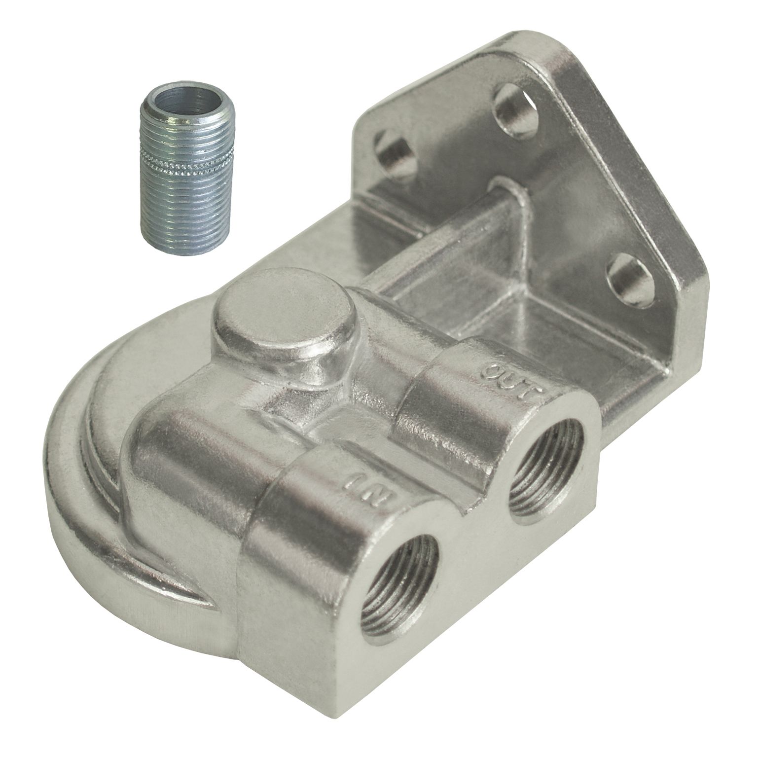 This new single remote filter mount is cast from high quality aluminum and features right only 1/2" NPT inlet and outlet ports and includes a 3/4"-16 threaded filter nipple.