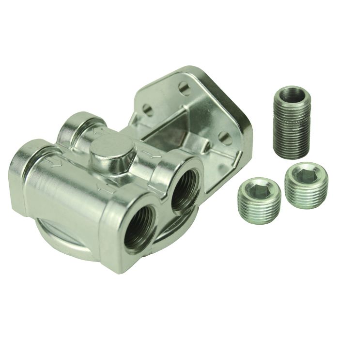 High quality die-cast aluminum thermostatic sandwich adapter with 3/8" NPT ports and an O-ring diameter of 2 3/4", this adapter provides external oil lines to allow the addition of an engine oil cooler. It installs between the stock engine oil filter landing and the oil filter. Stock filter is retained. Designed to be used on engines with a 3/4"-16 filter thread. Kit includes sleeve nut only.
