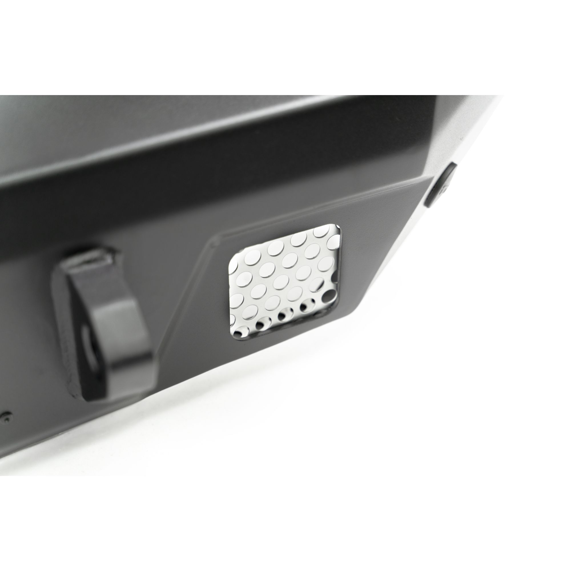 Our FS-7 Series Rear Bumper features a sleek, mid-width design. The FS-7 can fit up to a 37-inch spare tire above the bumper using the factory carrier. The bumper includes a license plate bracket with a license plate light to relocate the plate over to the side away from your spare tire. A pair of 1-inch thick reinforced mounts for D-ring shackles provide recovery options. Rear lighting options include (2) 3-inch pod light mounts that sit in a shielded position behind perforated aluminum accent panels. Welded zip tie tabs provide clean wire management.
