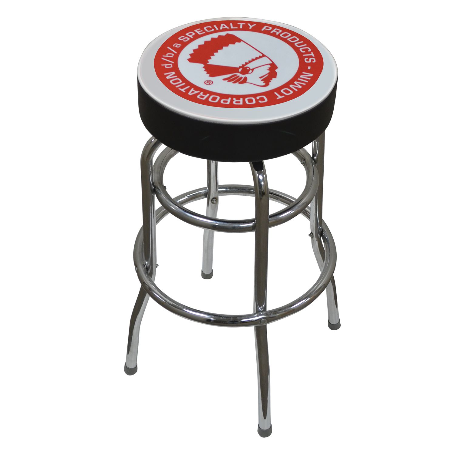This custom backless bar stool is a perfect addition to any shop. 30" high with chrome legs and a Specialty Products Company logo imprinted on the vinyl seat.