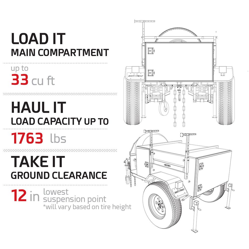 The Smittybilt Scout Trailer is built to withstand the toughest adventures, featuring a rugged, fully boxed galvanized steel frame with a durable powder-coated finish and a robust 1,763 lb payload capacity. Engineered for off-road exploration, it boasts independent suspension, electric axle brakes with a breakaway system, and multiple 2-inch receivers for versatile hitch options. With ample storage, including a spacious main compartment, side cabinets for your generator or kitchenette, and dual sliding floors, it ensures you have everything you need for your journey. Removable fenders, a swing-away tongue jack, and integrated tie-down points complete this adventure-ready trailer.