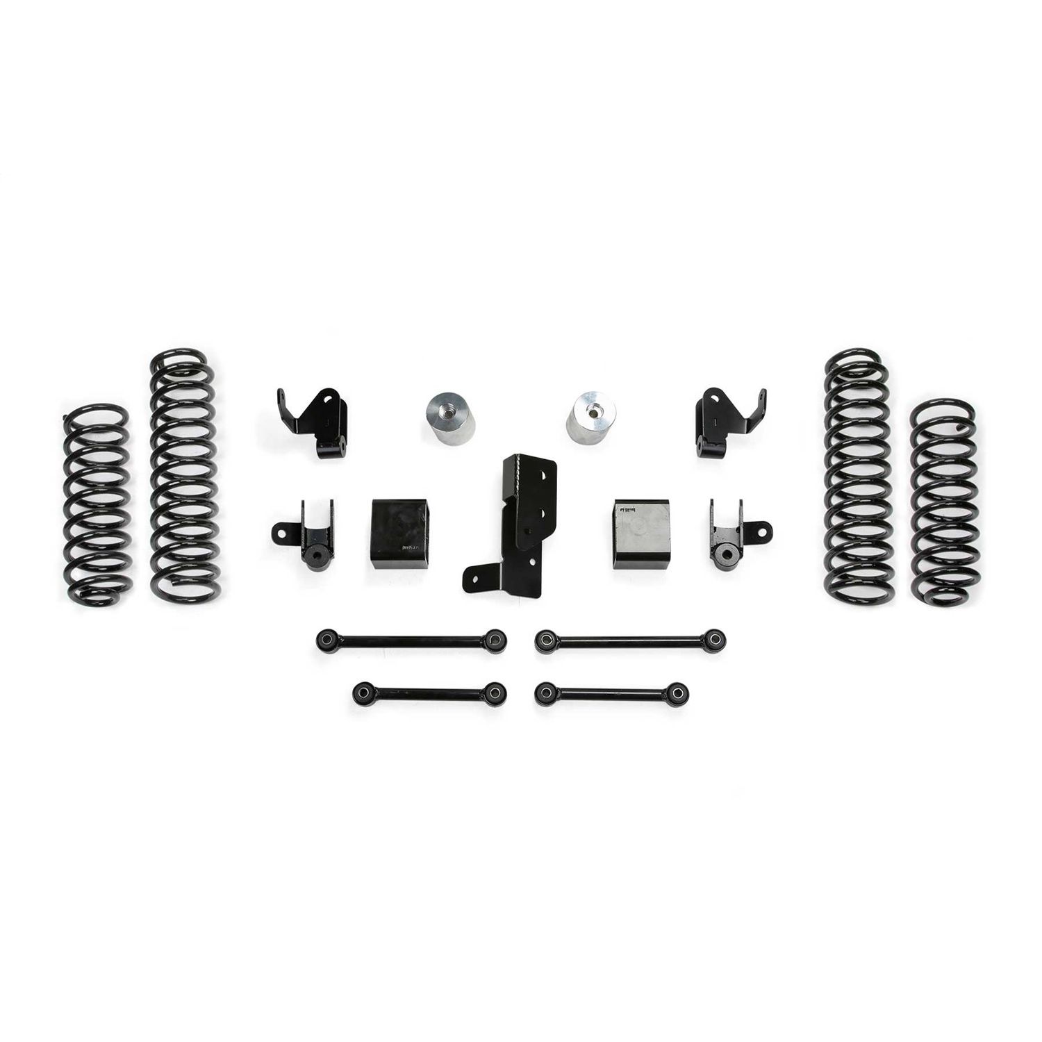 The Sport system features American made coil springs that are a Dual Rate design allowing for long travel suspension use offroad with a smooth highway ride. The first stage of the spring provides a soft ride with the ability to extend for additional travel. The second stage is designed to handle the payload of the vehicle and address large impact absorption at higher speeds. The Dual Rate coil springs are corner specific to the JL. This keeps the vehicle level side to side while allowing for increased suspension travel. Four bump stops extensions utilize the factory bump stops for compliant cushioning at full compression. The extensions retain the stock down travel to eliminate over cycling of the suspension and driveline. The extended length front and rear sway bar links with urethane bushings reposition the bars to work within the factory operating planes. By extending the length of the links, it prevents the sway bar from going over center and creating bind at full extension travel. A heavy duty rear track bar bracket re-centers the axle while retaining the factory roll center of the vehicle with the increased ride height.