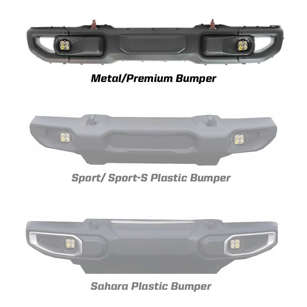 Baja Designs next generation Squadron(R) SAE fog pocket kit for the Jeep JL Wrangler/JT Gladiator is the perfect road-legal auxiliary fog light on the market today. Engineered with all-new aspheric projector optics and with our advanced LED technology provides a performance increase in luminous flux of 56% over our previous generation SAE model. The all-new Squadron(R) SAE delivers 2,420 lumens per light with output reaching up to 15,800 candela at just 29 watts. Keeping you safe on the road or trails, the Squadron(R) SAE will illuminate Zone 1 with a controlled, sharp cutoff from the combination of the new LED technology and highly efficient aspheric projector optics. Designed to meet the current SAE J583 fog lamp requirements, the Squadron(R) SAE is fully compliant with on-road regulations. This innovative approach allows for a highly controlled light pattern with a sharp cutoff, making them an ideal choice for driving through dust, fog, and inclement weather. Backed by our limited lifetime warranty and 30-day satisfaction guarantee, giving you the ultimate in-purchase protection. NOTE: This kit includes vehicle specific brackets for the following application: JL Rubicon/Gladiator w/ OE Rubicon Premium Bumper. USPTO Reg No. 5,766,659