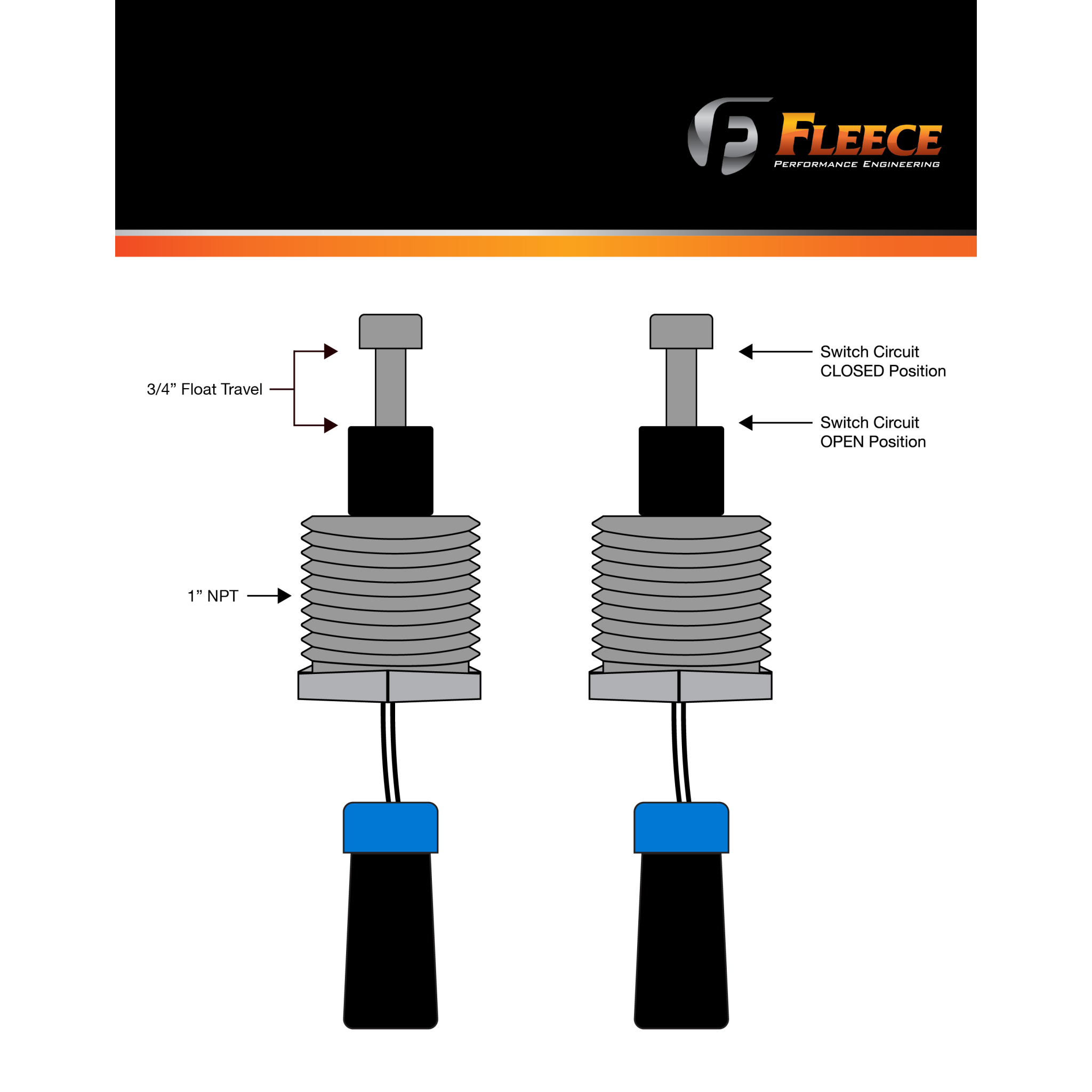 Stainless Steel universal coolant level switch for use with the Fleece Performance coolant tank part numbers FPE-34235 (discontinued) and FPE-CUMM-CLNT-TNK-1318 or custom configuration tanks. Features a stainless steel body with 1" NPT thread, 8" harness, and two-pin metripack connector for direct connection to the chassis harness on a 2013-2018 RAM with 6.7L Cummins. Features Stainless steel construction 1" NPT body 3/4" float travel Switch Circuit CLOSED when full Switch Circuit OPEN when empty Application Notes Direct replacement for Fleece Performance coolant tank FPE-34235. May also be used with any aftermarket or custom tanks equipped with a 1" NPT bung.