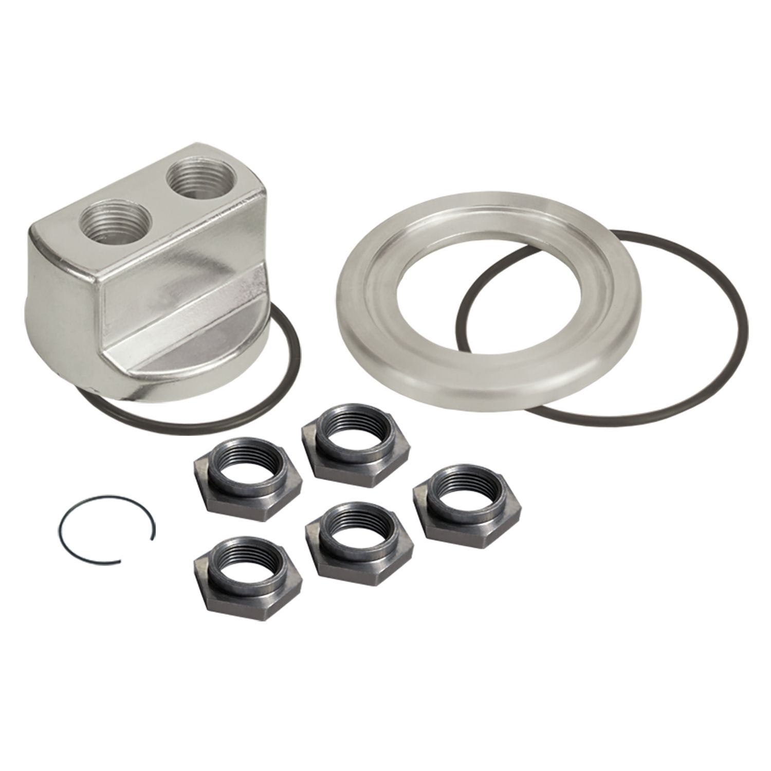 Kit includes a high quality, die cast aluminum 1/2" NPT spin-on adapter designed to fit most passenger vehicles on the road today with 2 1/2" to 3 1/2" oil filter landings. Spin-on adapters provide external oil lines to allow the addition of an engine oil cooler and/or remote filter mount, installing at the stock engine oil filter location. This all-new version has a billet style look and has an ultra-bright, polished appearance.