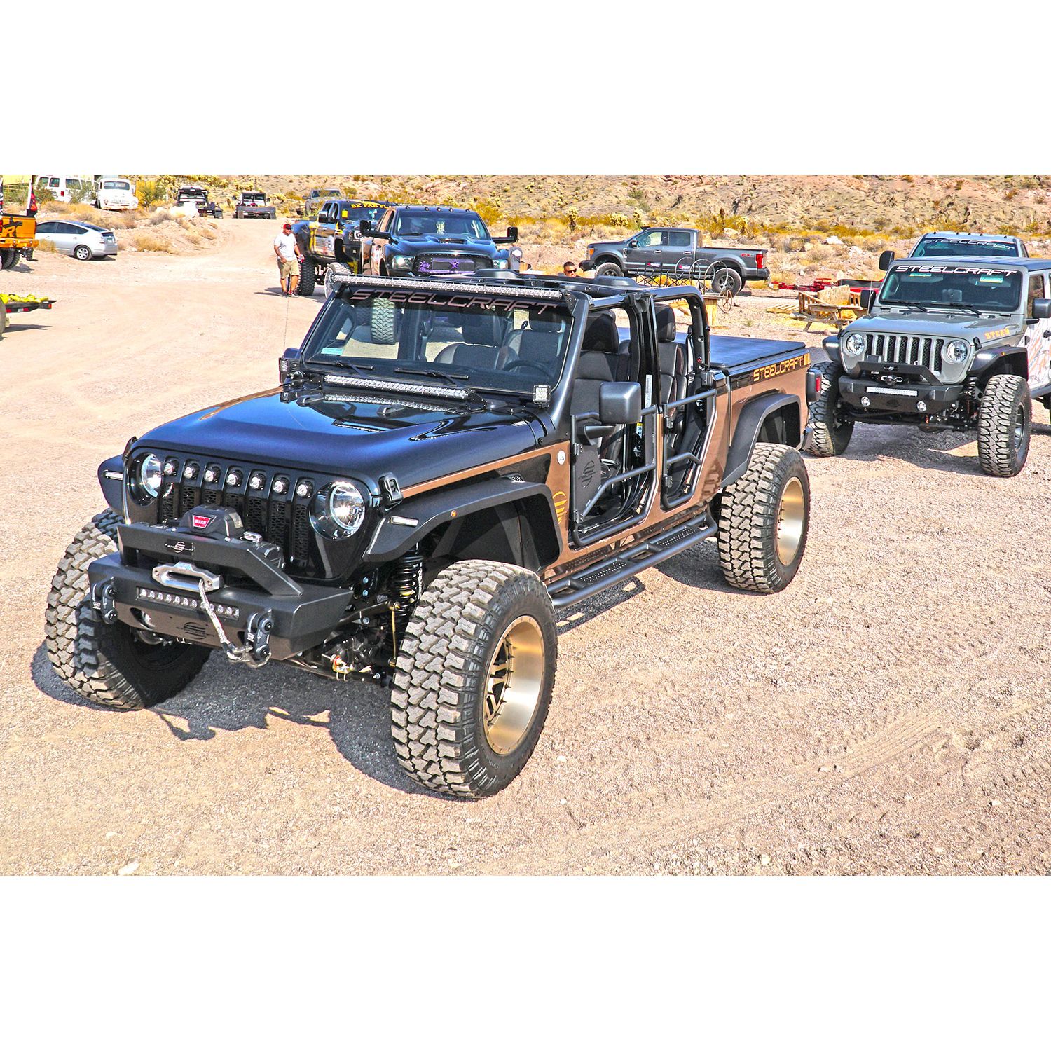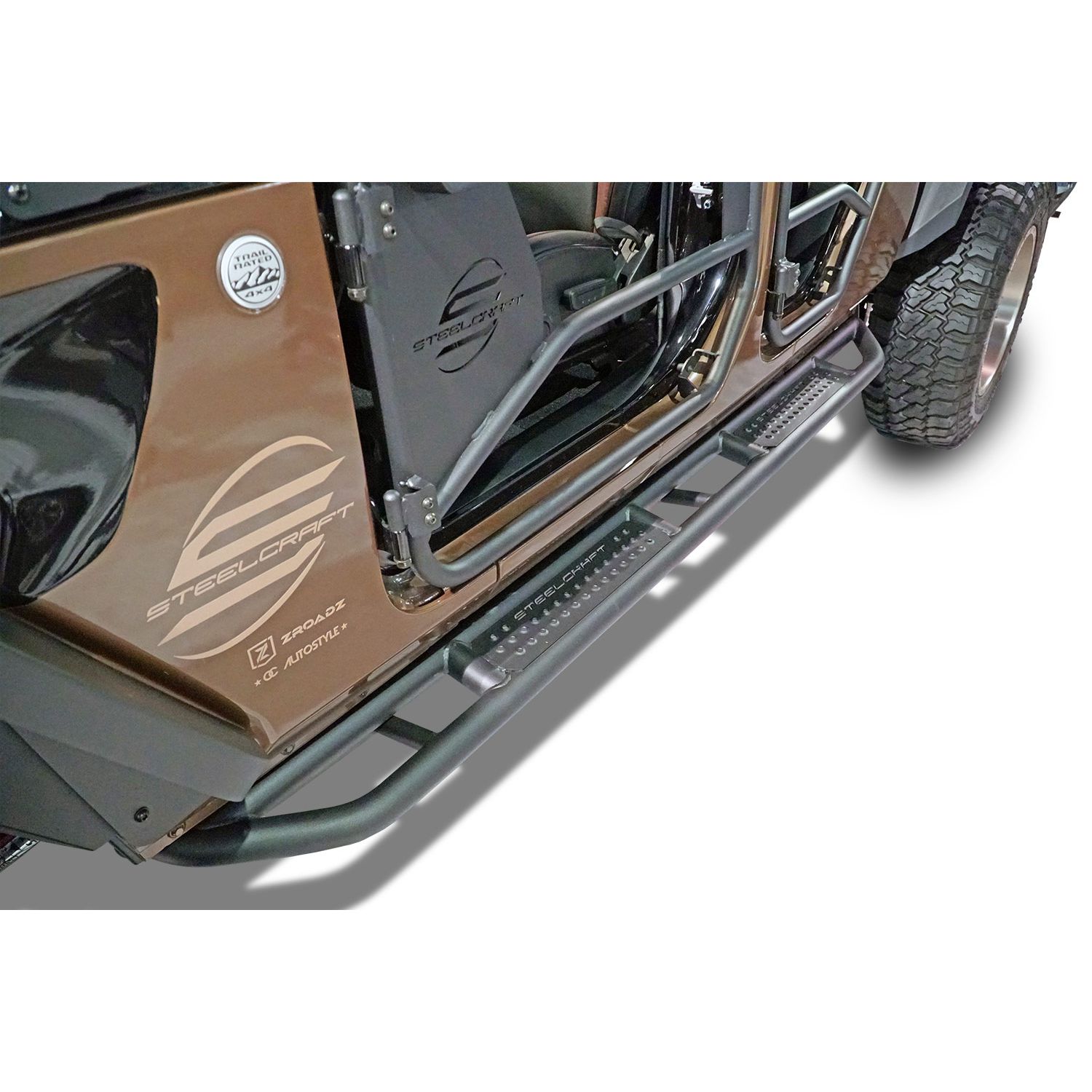 Steelcraft's Jeep Rocker Armor Steps feature a strong 2" tube structure, one piece fully welded design, reverse punch plate surface for maximum step traction and install to OE mounting locations. E-coat + Powder Coat Texture Black Finish