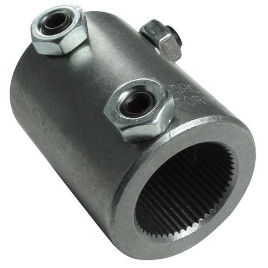 Using a 2? straight extension, called a coupler, to extend the steering box, R&P shaft or the column shaft can sometimes eliminate a universal joint. The coupler can be welded or pinned to the un-splined end of a shaft. The 1?- 48 and 1? DD couplers have a 1-1?4? hole that will accept either an adapter to reduce inside diameter to 3/4? smooth or another splined or 3/4? DD coupler. The coupler assembly would have to be pinned and/or welded together. Welding the coupler is acceptable because there are no moving parts to damage and the coupler's steel is less susceptible to heat damage from welding. Couplers are available in the same spline and Double D sizes as our universal joints. Couplers and adapters are available in steel and stainless steel only.