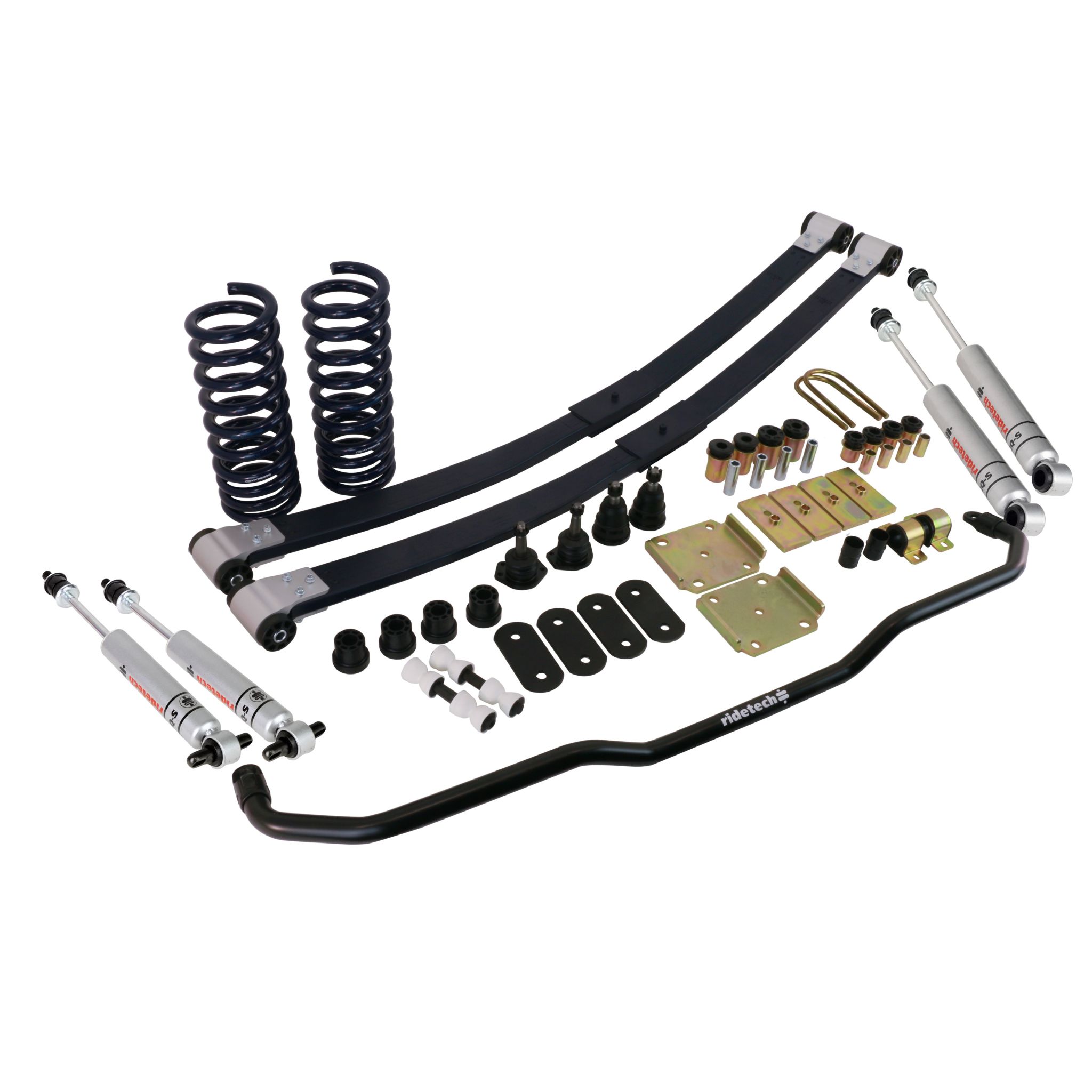StreetGrip suspension system for 1967-1969 GM F-Body with big block. Includes front dual rate coil springs, composite leaf springs, delrin control arm bushings, ball joints, front sway bar and RQ-S shocks.