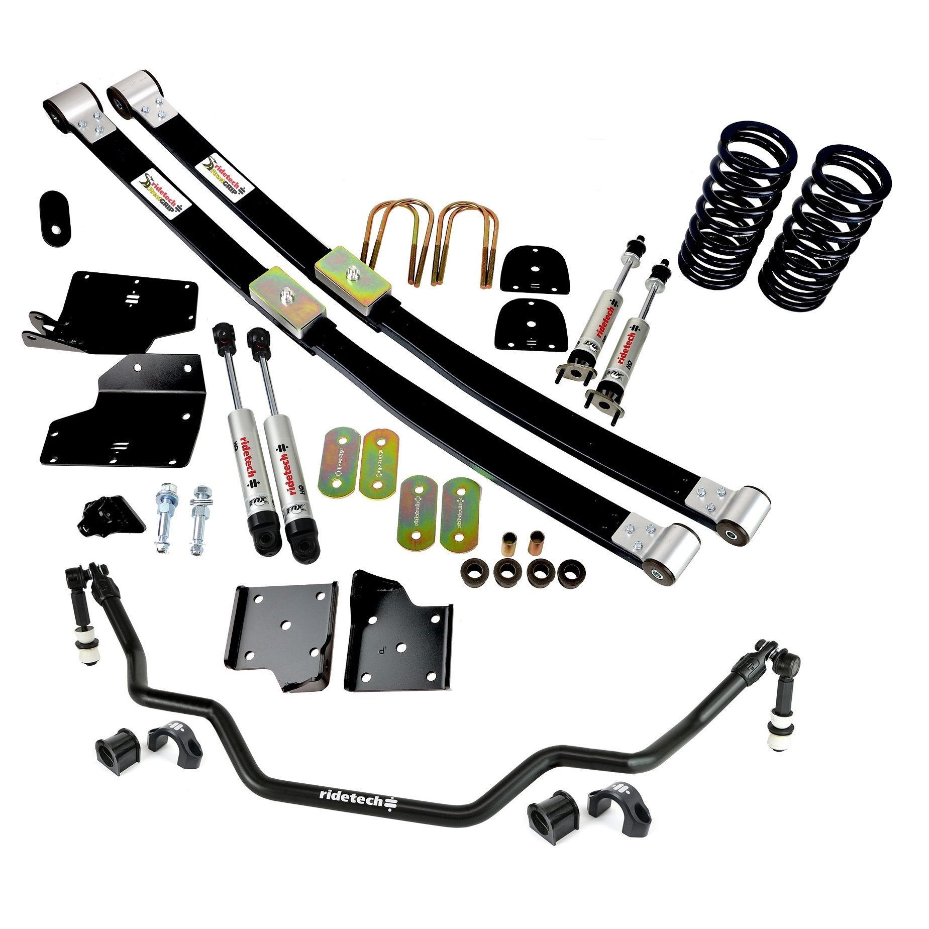 StreetGrip suspension system for 1967-1970 Mustang with small block, without front arm bushings, shafts and bj plates. Includes front dual rate coil springs, rear composite leafs, delrin leaf spring bushings, front sway bar and HQ shocks.