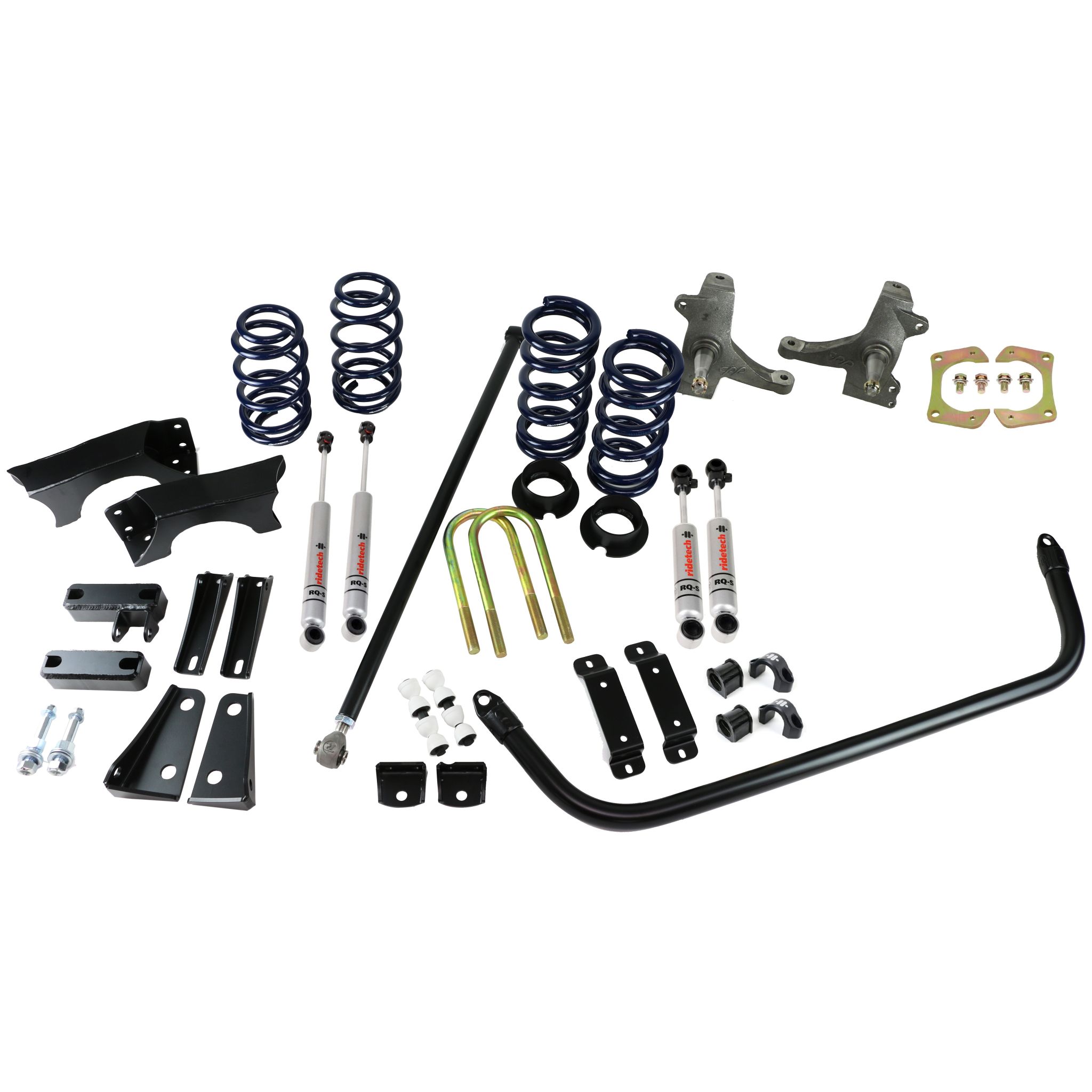 StreetGrip suspension system for 1971-1972 C10 with big block, no bushings. Includes front coil springs and cups, rear dual rate coil springs, drop spindles, front sway bar, rear c-notches, panhard bar and RQ-S shocks.