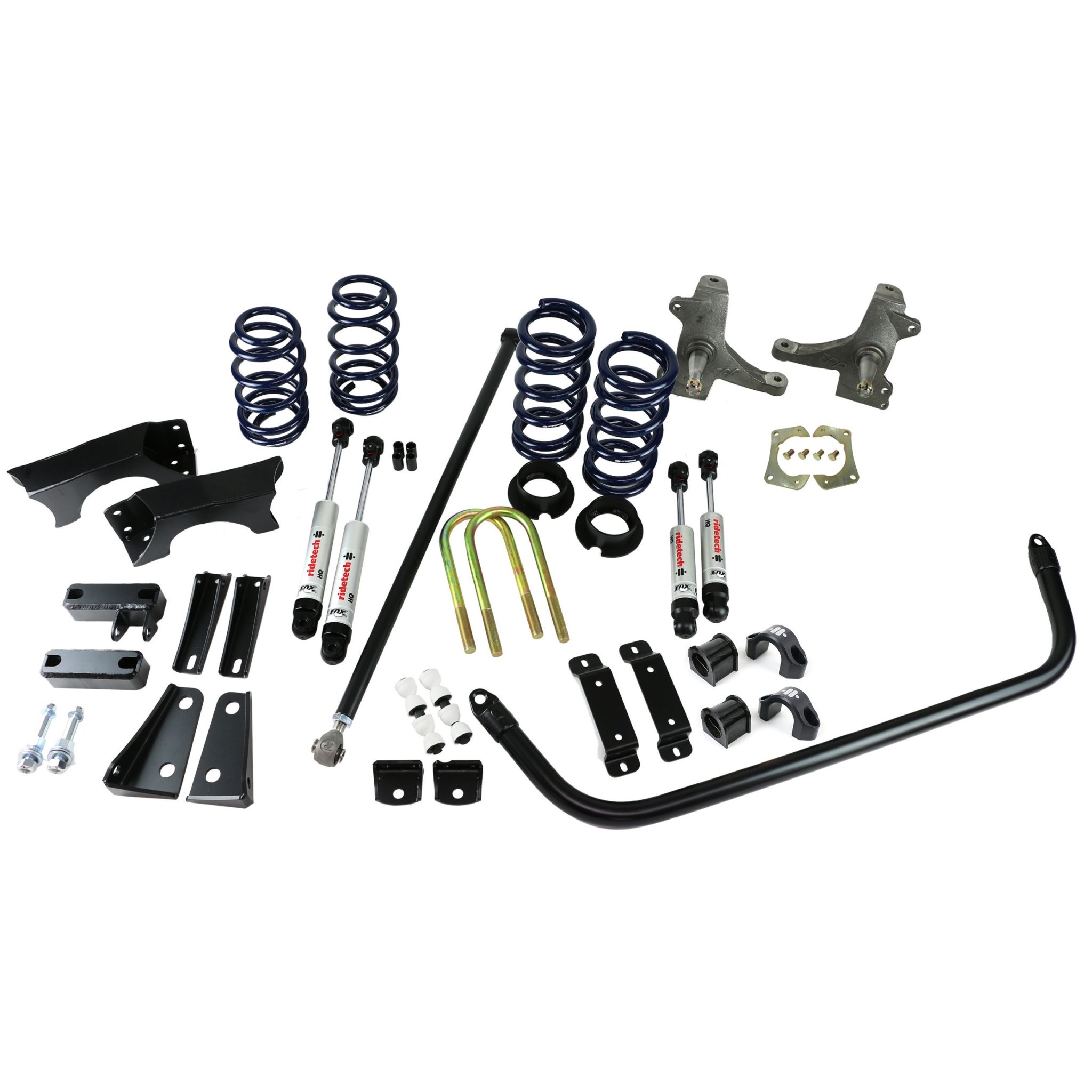 StreetGrip suspension system for 1971-1972 C10 with small block, no bushings. Includes front coil springs and cups, rear dual rate coil springs, drop spindles, front sway bar, rear c-notches, panhard bar and HQ shocks.