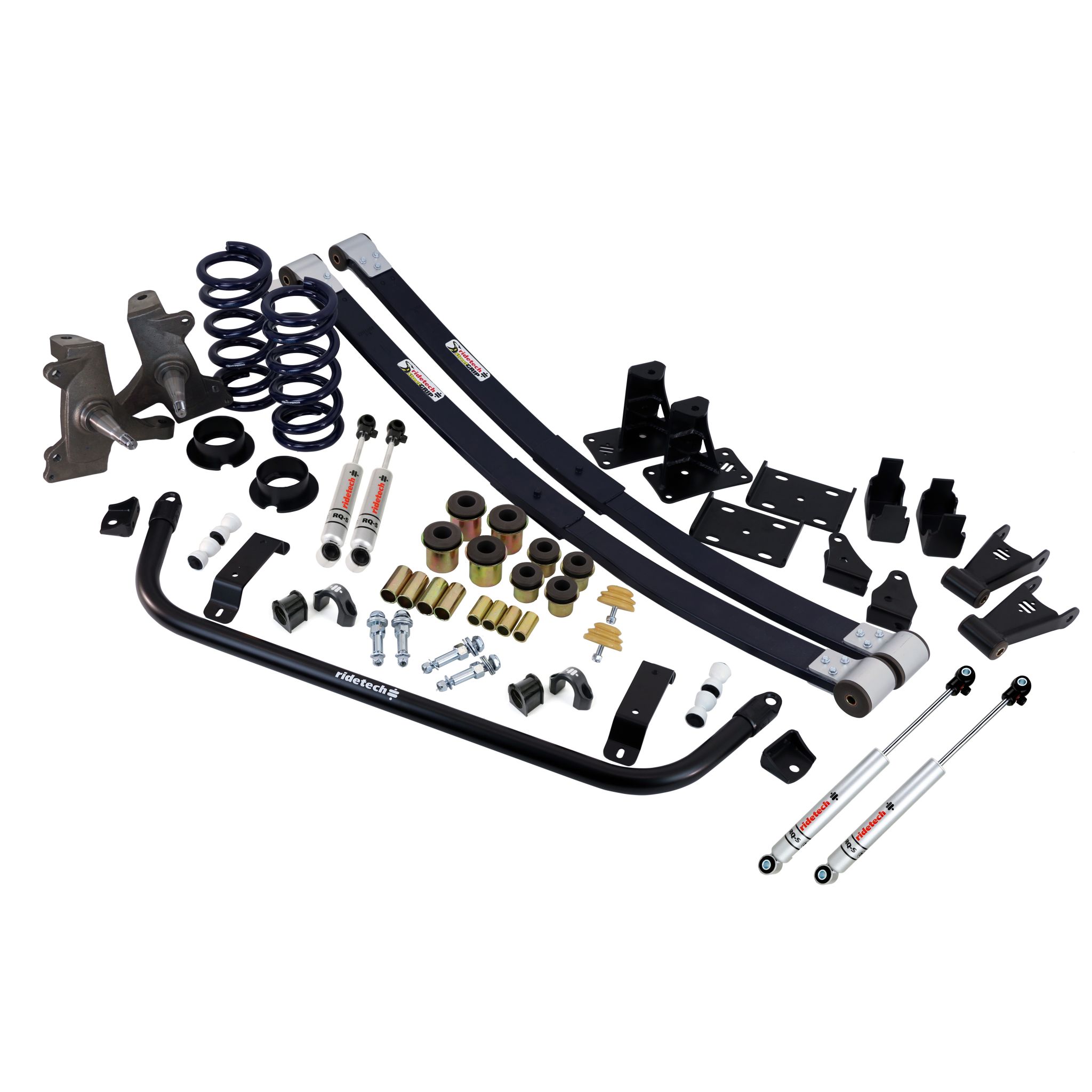 StreetGrip suspension system for 1973-1987 C10 with big block. Includes front coil springs, composite leaf springs, delrin control arm bushings, drop spindles, front sway bar, leaf spring delrin bushings and RQ-S shocks.