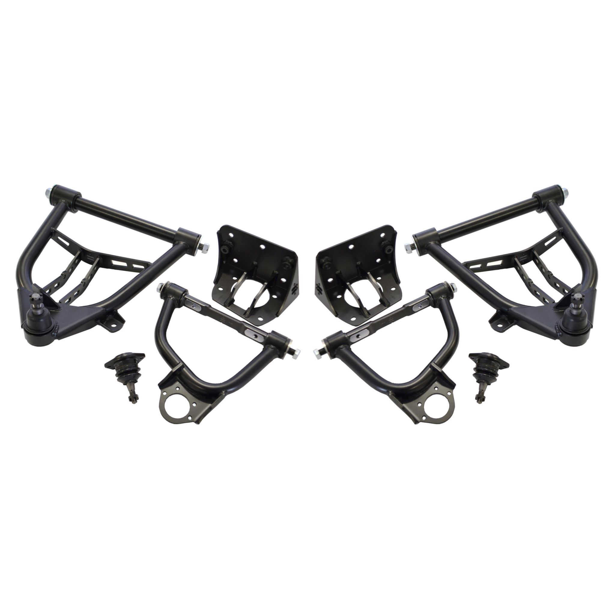 StrongArm system for 1971-1972 C10. For use with Coil-Overs, sold separately. Includes upper and lower tubular control arms, delrin bushings, ball joints, cross shafts, upper coil-over mount and hardware. Powder coated satin black.