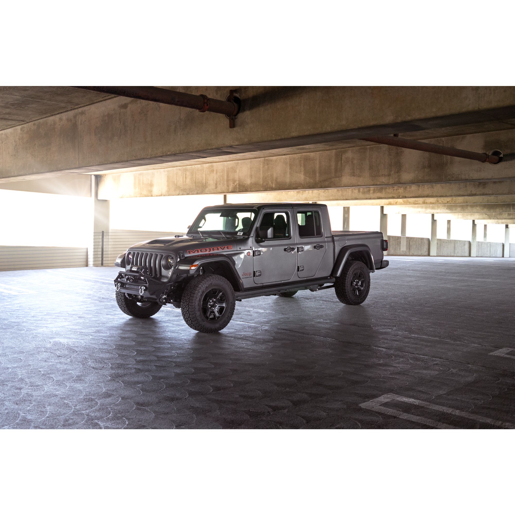 This stubby winch front bumper was designed to maintain good clearance off-road, recovery options, and supplemental lighting. It is compatible with the Wrangler JK & JL, as well as the Gladiator JT. Multiple size winches can be installed in a recessed winch tray behind the protective tubular bull bar. 1-inch thick D-ring mounts that take ?-inch shackle pins provide additional recovery options. An inset light mount in the center of the bumper fits the DV8 Elite 20?, Baja Designs 20?, or Rigid 20? dual row light bars. The bumper is finished in a micro-texture black powder coat, and features a completely bolt-on installation.
